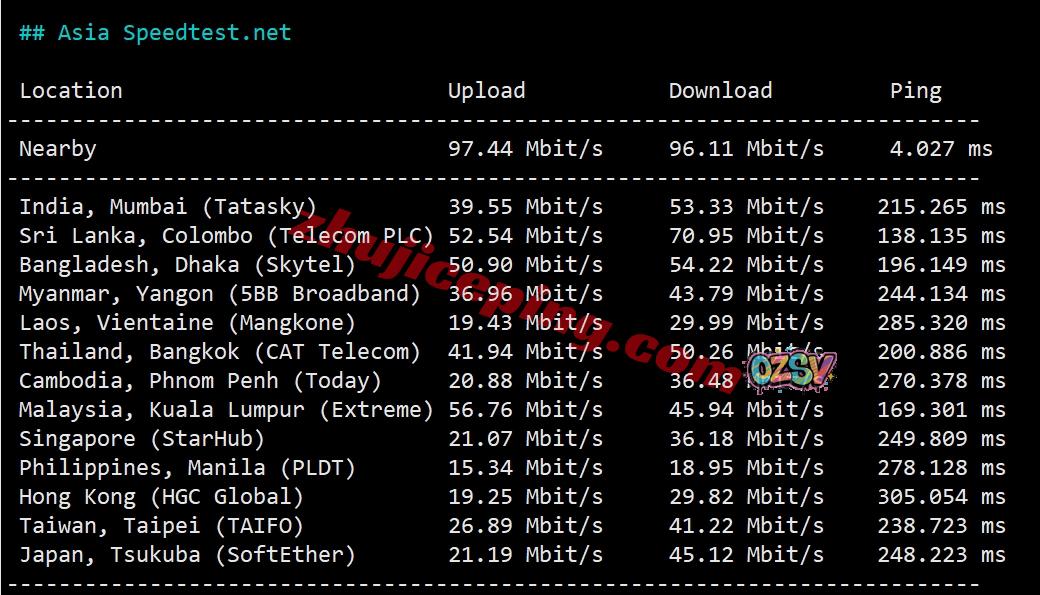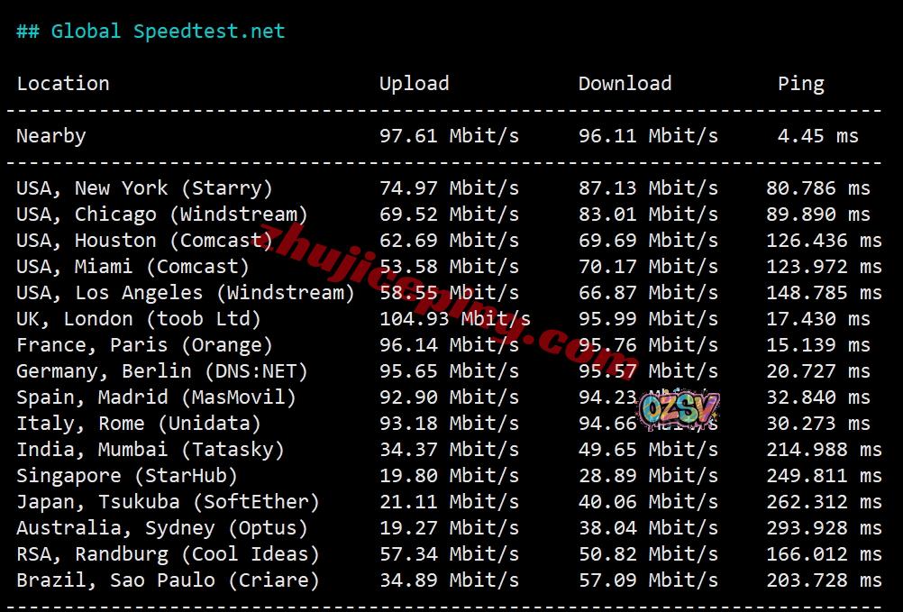 默认100Mbps带宽,我们用国内三网多节点跑一下看看带宽上下行的测试数据: