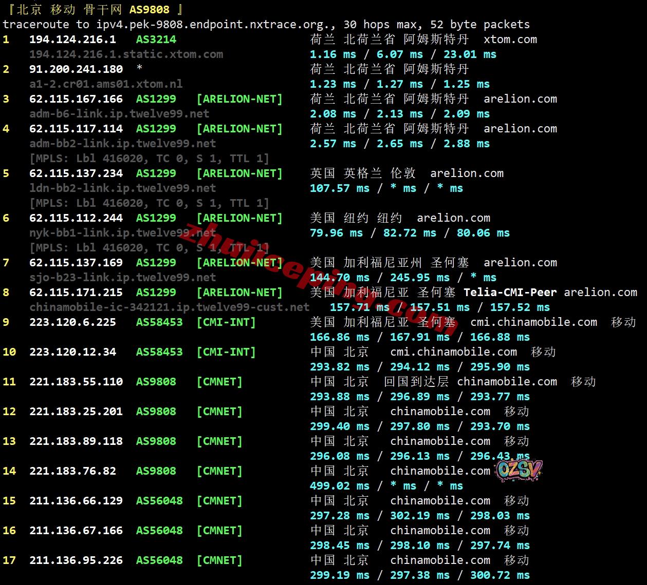 北京方向:走twelve99/telia经过英国去美国纽约然后到圣何塞,然后转移动圣何塞节点再直连回国