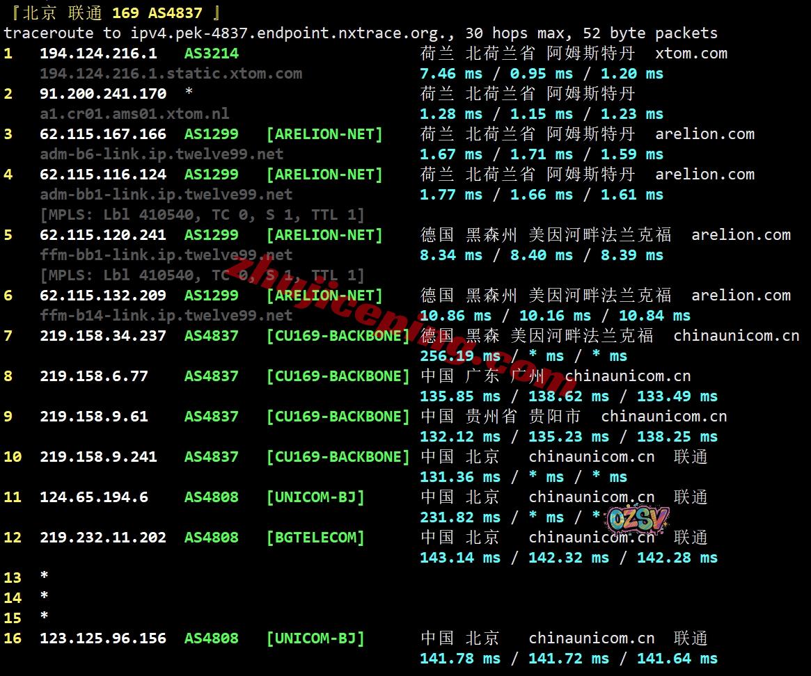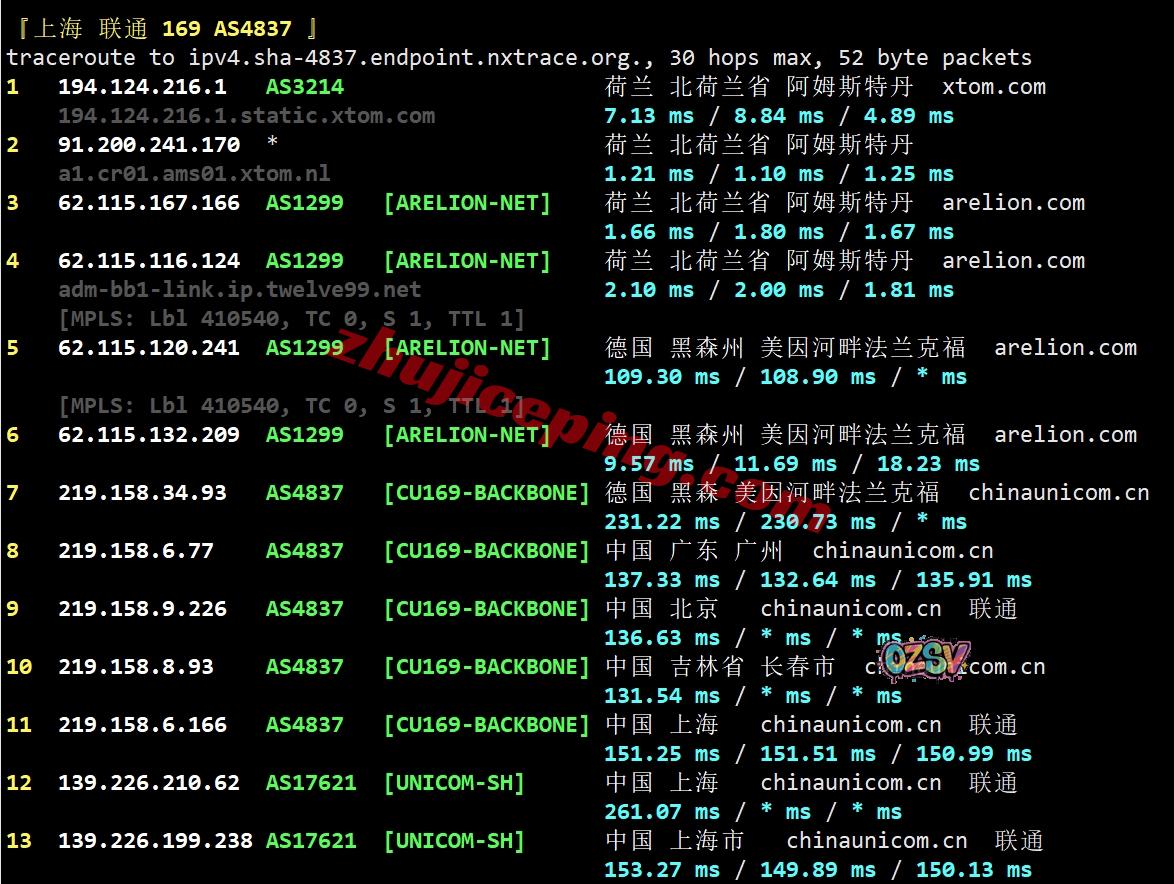 北京/上海方向:走twelve99/TELIA经过德国法兰克福转联通节点后直连回国