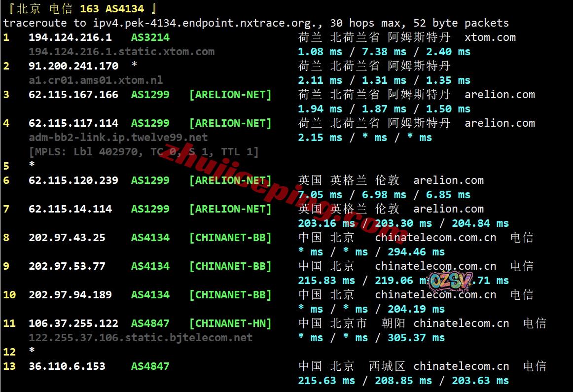 电信去程:电信转联通后出海,直连联通英国伦敦节点,然后去荷兰阿姆斯特丹
