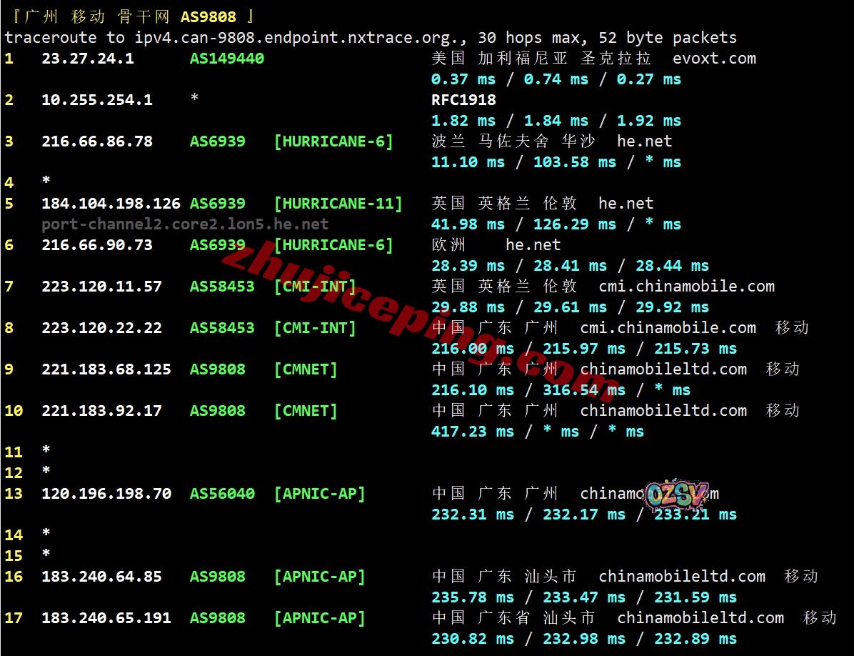 广州方向:走HE.NET经过英国,从移动英国伦敦节点直连回国