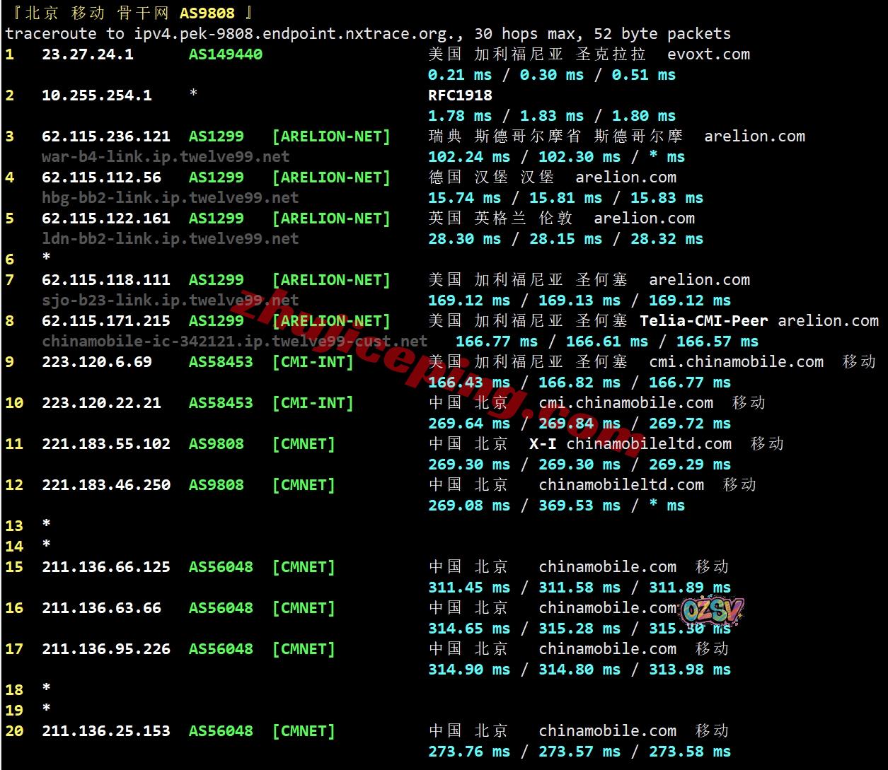 移动去程:直连移动英国伦敦节点,然后转cogent去荷兰、波兰。