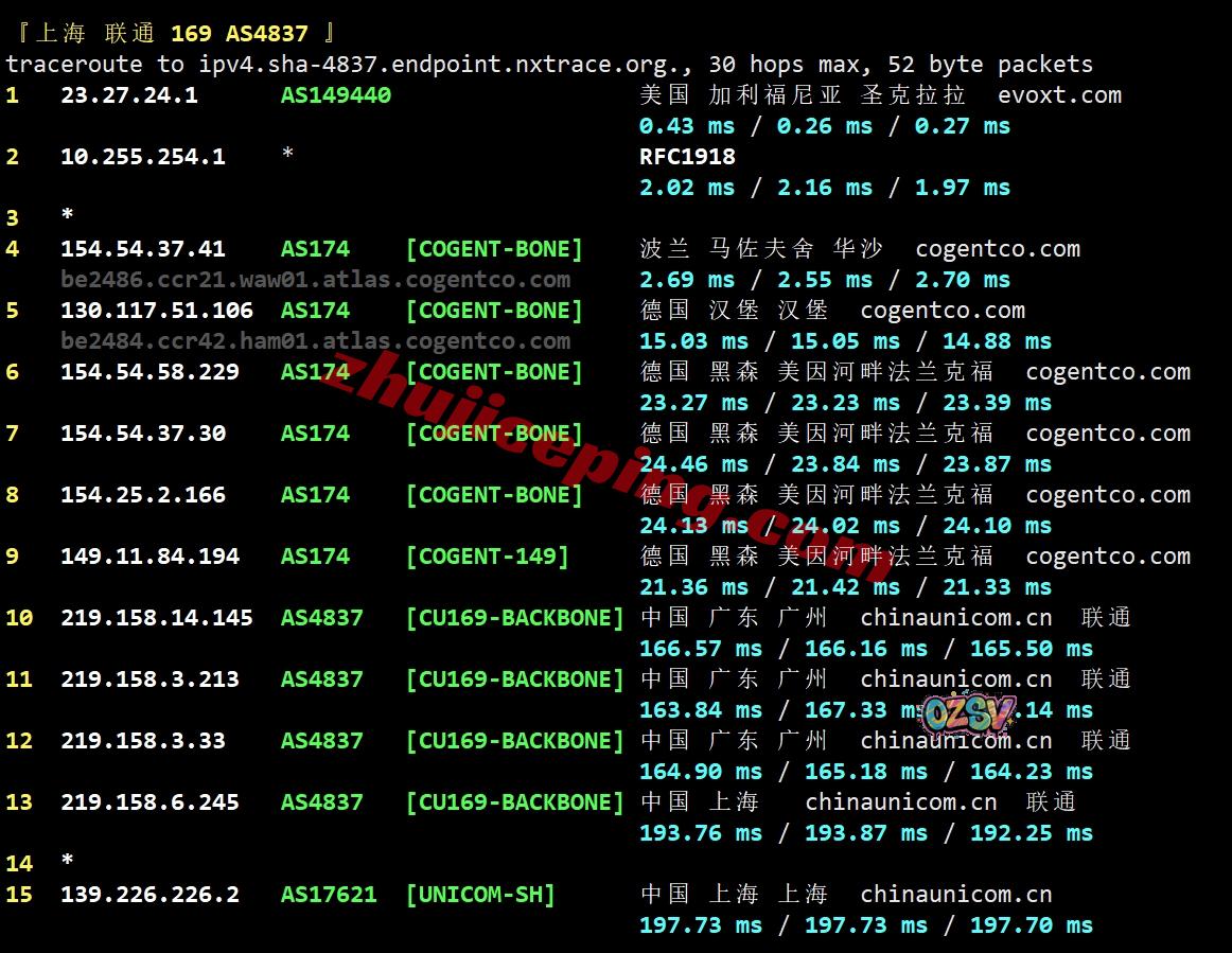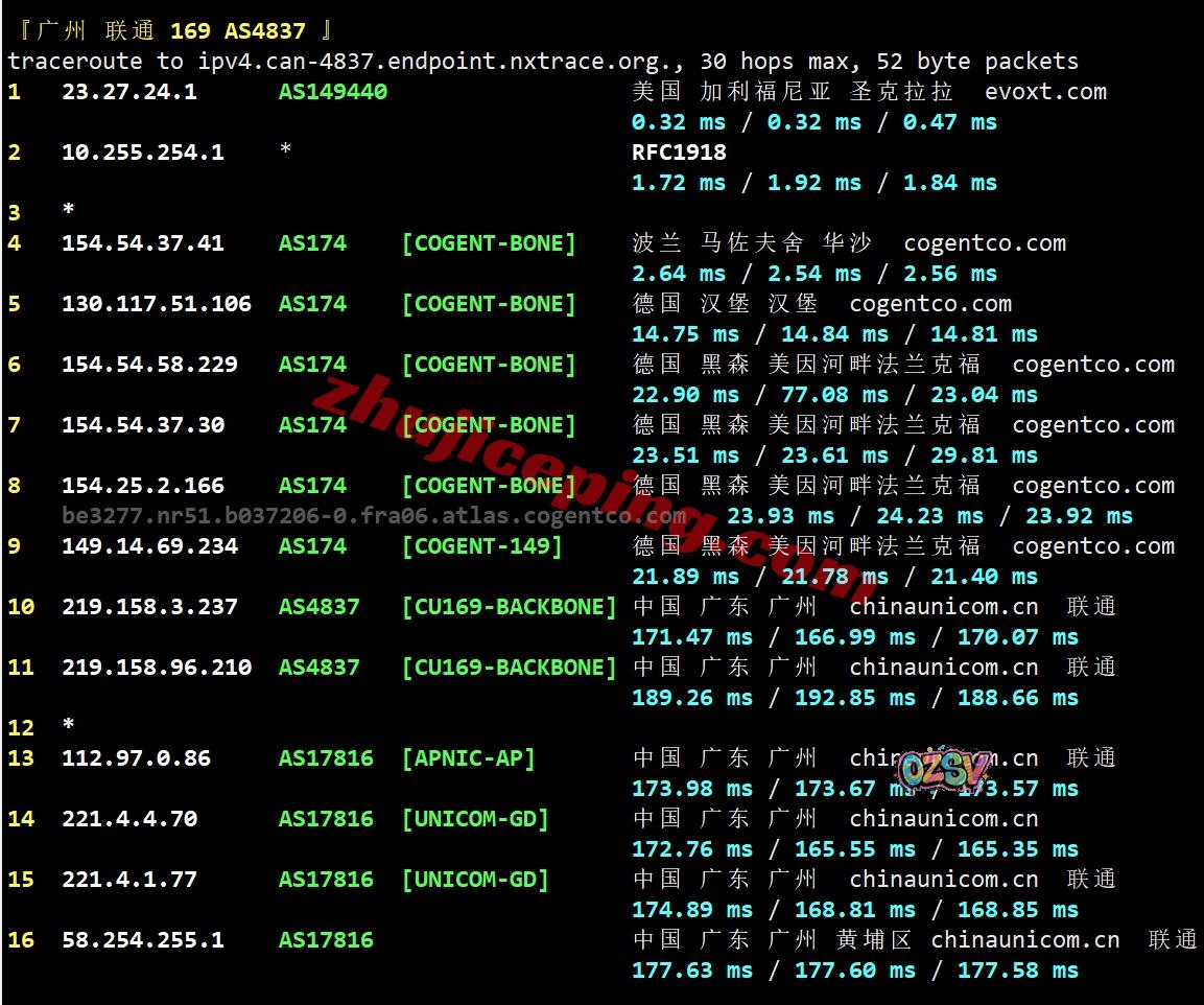 上海/广州方向,走cogent经过德国出海回国,纯国际线路,