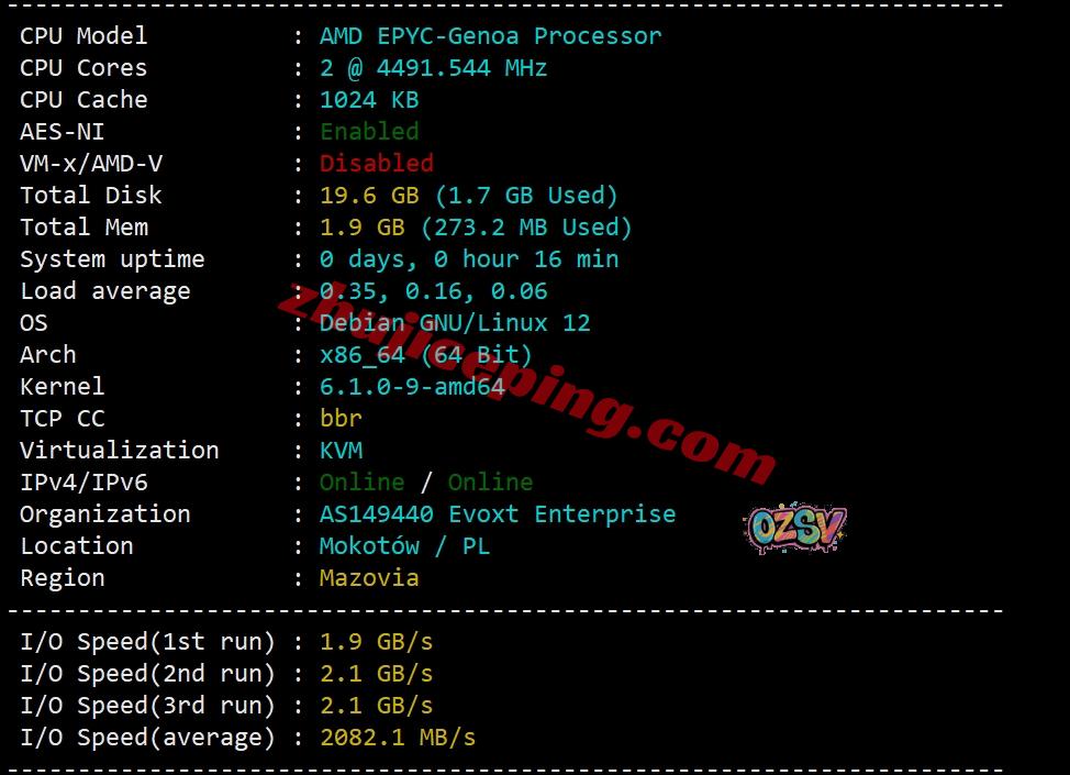 evoxt上架了波兰华沙数据中心的vps业务,采用AMD EPYC 4.8 GHz+主频的CPU、NVMe SSD阵列、1Gbps带宽,从2G内存开始支持Windows操作系统,低至2.99美元/月。从官方说明的配置来看应该属于高端硬件的母鸡,大致判断性能也应该是顶级的,由于服务器所在机房在欧洲波兰,所以VPS实际情况怎么样?那还是需要我们实测通过数据来判断是否适合国内用户使用。主机测评给大家带来了测评的部分数据,仅供参考。