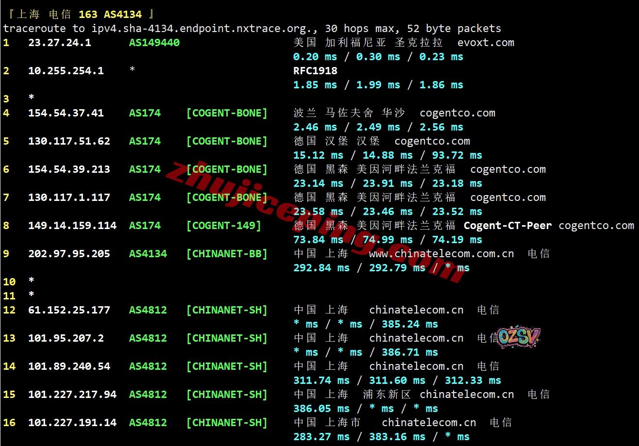 上海方向:走cogent经过德国,从德国法兰克福移动节点直连回国
