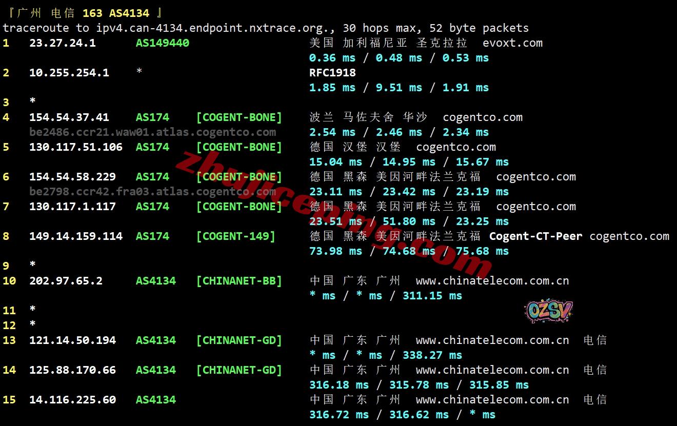 电信回程:走cogent经过德国,从德国法兰克福的peer(cogent)直连回国