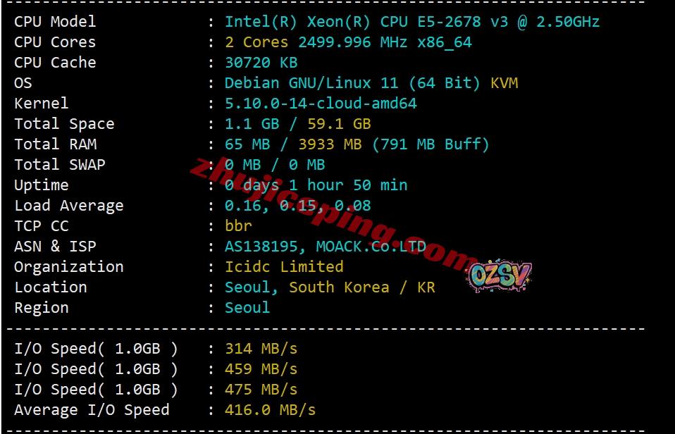 CPU型号为e5-2678v3(一般双路,24核、48线程、2.5GHz主频)、启用了BBR,蘑菇的网络,归属地韩国首尔,当前硬盘I/O大致416MB/S: