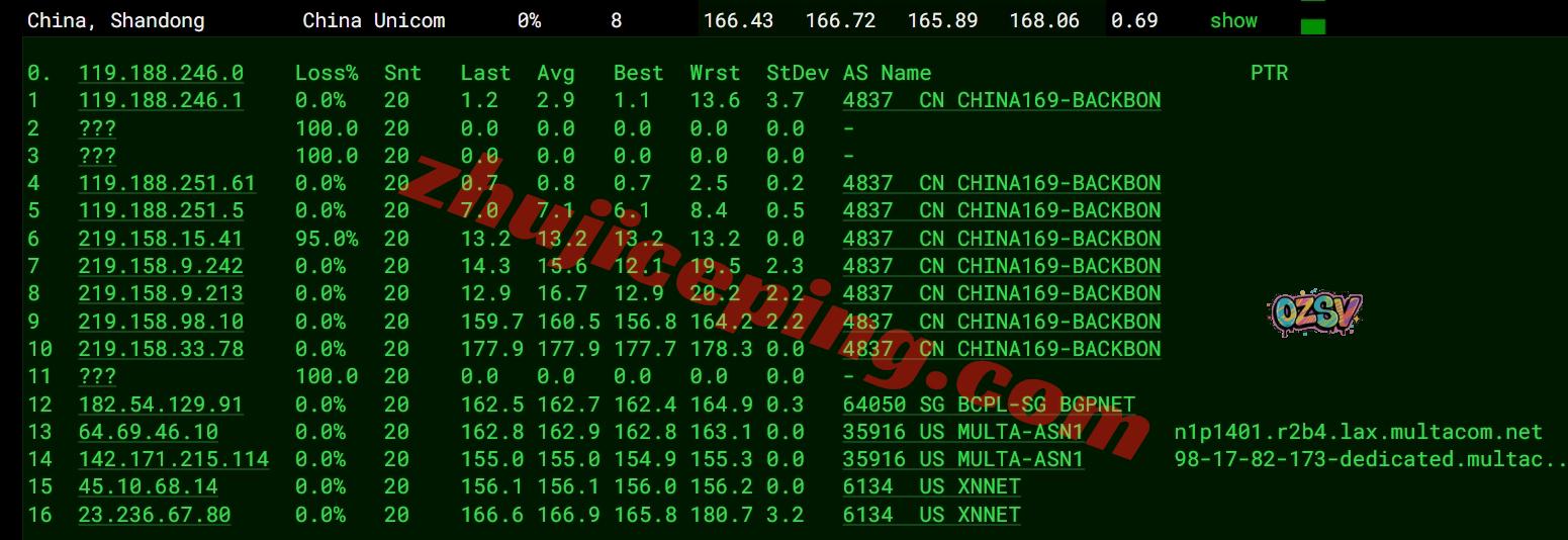 联通去程:直连联通美国洛杉矶节点然后接bgp.net去multacom机房