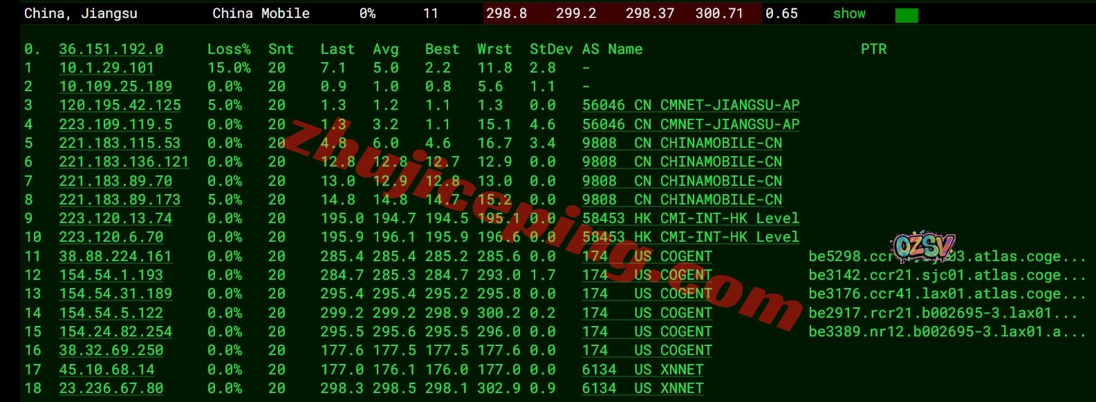 移动去程:直连移动美国圣何塞节点然后接cogent去洛杉矶