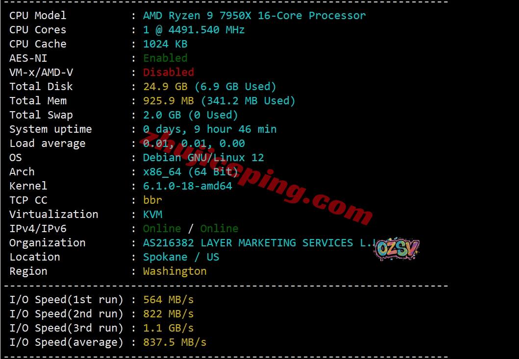 layer.ae在美国西海岸华盛顿州斯波坎市有部署vps业务,由于在美国西海岸离是比较适合中国大陆人群的,再加上配备的是10Gbps大带宽、AMD Ryzen 9 7950X+DDR5+ NVMe PCIe4.0高性能平台,有不少人都有兴趣想尝试一下。不少人说最低配20刀/年的几乎都没有货,不想花钱去买个线路不好的vps浪费钱。这里主机测评就给大家做个测评吧,测试数据仅供大家参考,适合你的话再考虑吧。