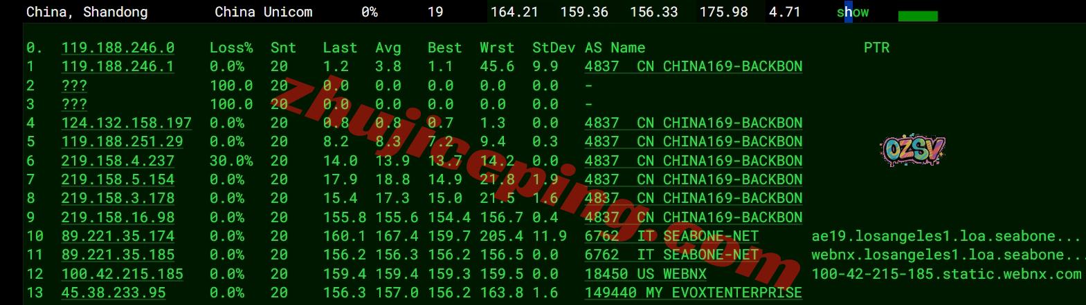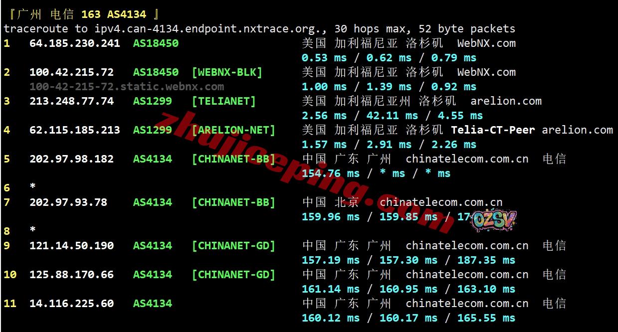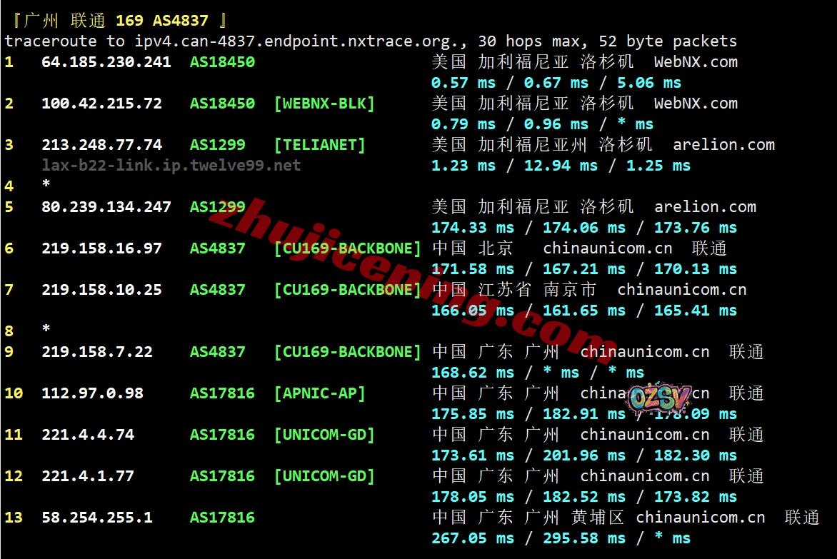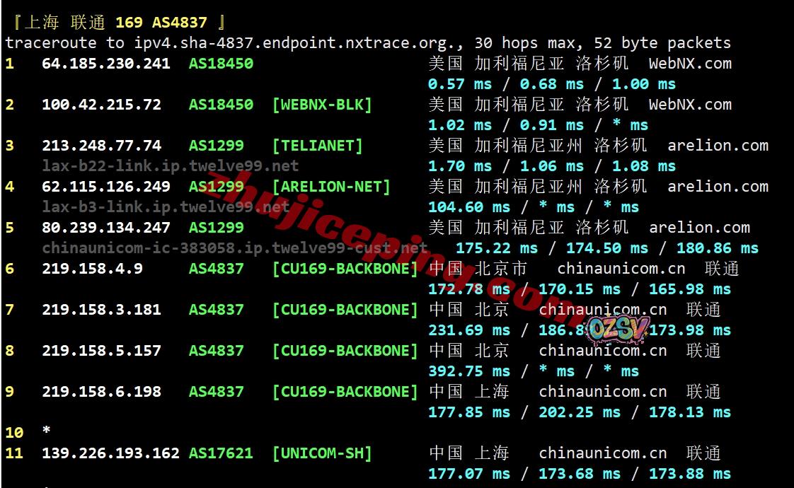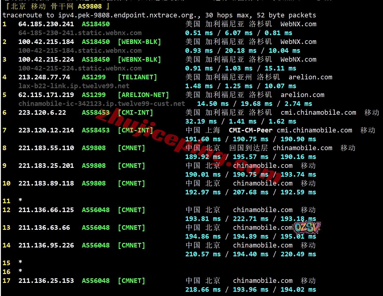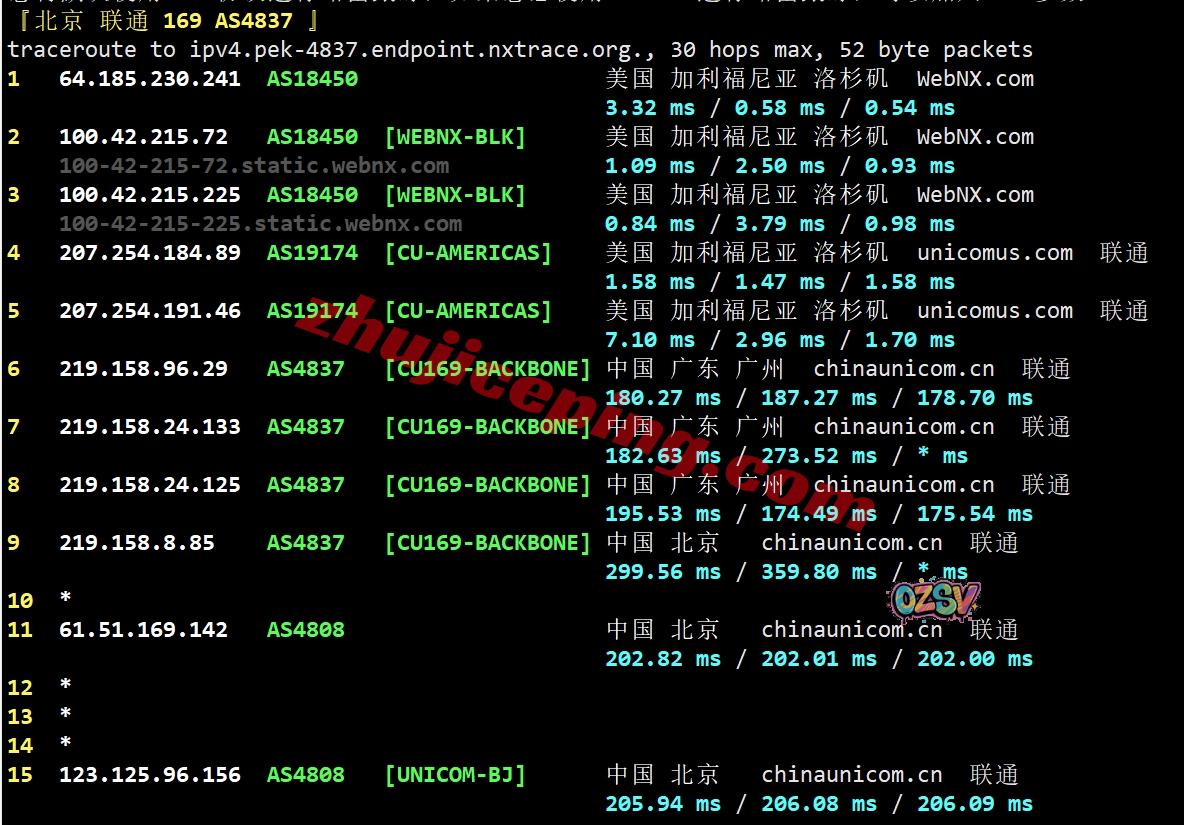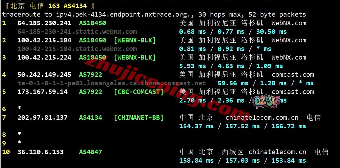 北京方向:webnx洛杉矶机房出来走Comcast直接出海回国