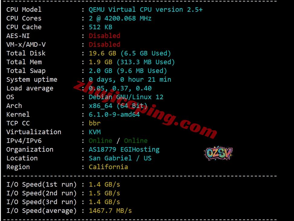 CPU型号未知,主频还蛮高的4.2GHz,启用了BBR,支持IPv6,看起来部分数据还没有更新,当前I/O大致1467MB/S: