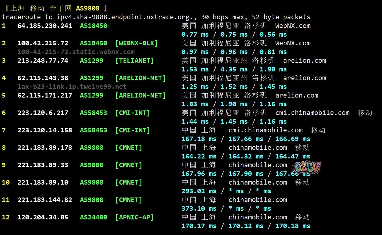 移动回程:走twelve99与移动在洛杉矶的peer后进入移动洛杉矶节点,然后直连回国
