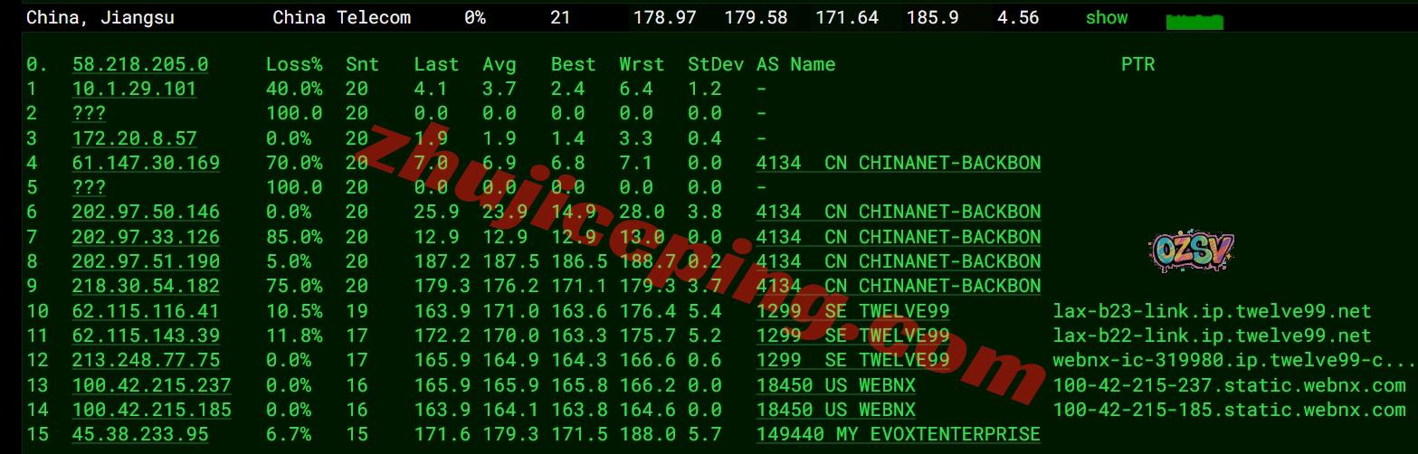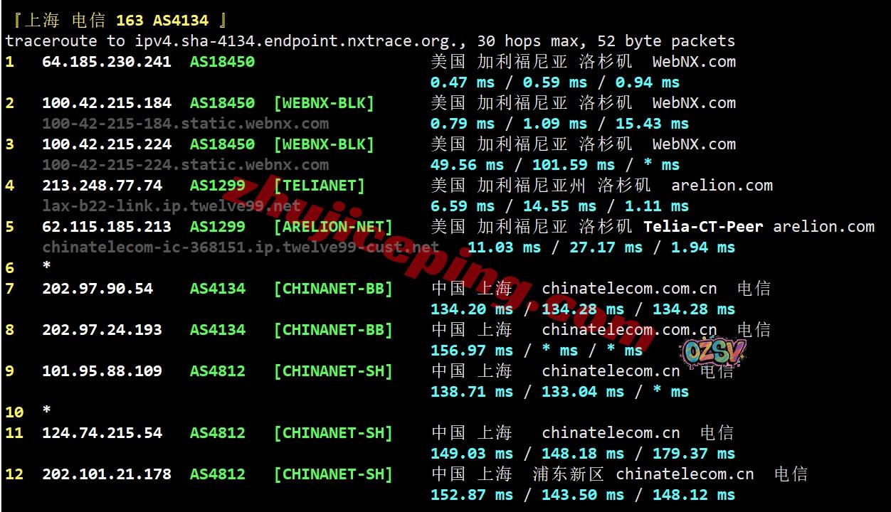 电信去程:直连电信圣何塞节点然后接twelve99去洛杉矶webnx机房
