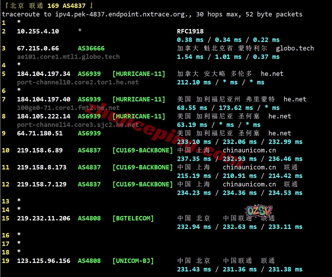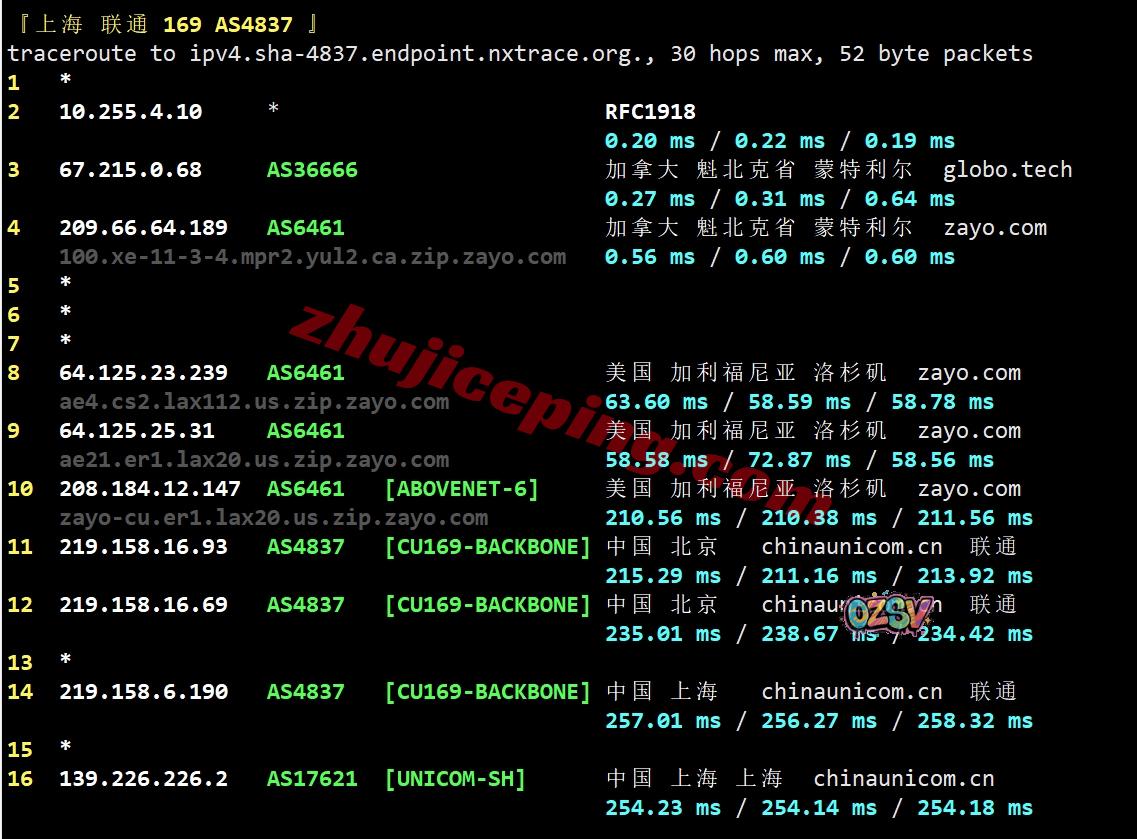 联通去程:直连联通美国圣何塞节点,然后接zayo经过丹佛去加拿大多伦多
