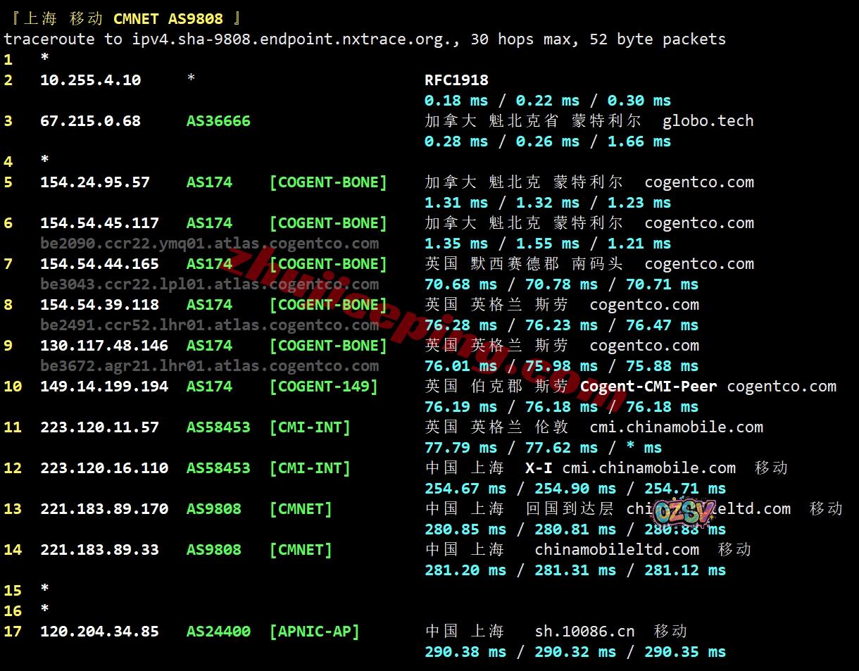上海方向:走cogent先去英国,在斯捞接移动CMI的peer然后再伦敦走移动CMI节点直连回国