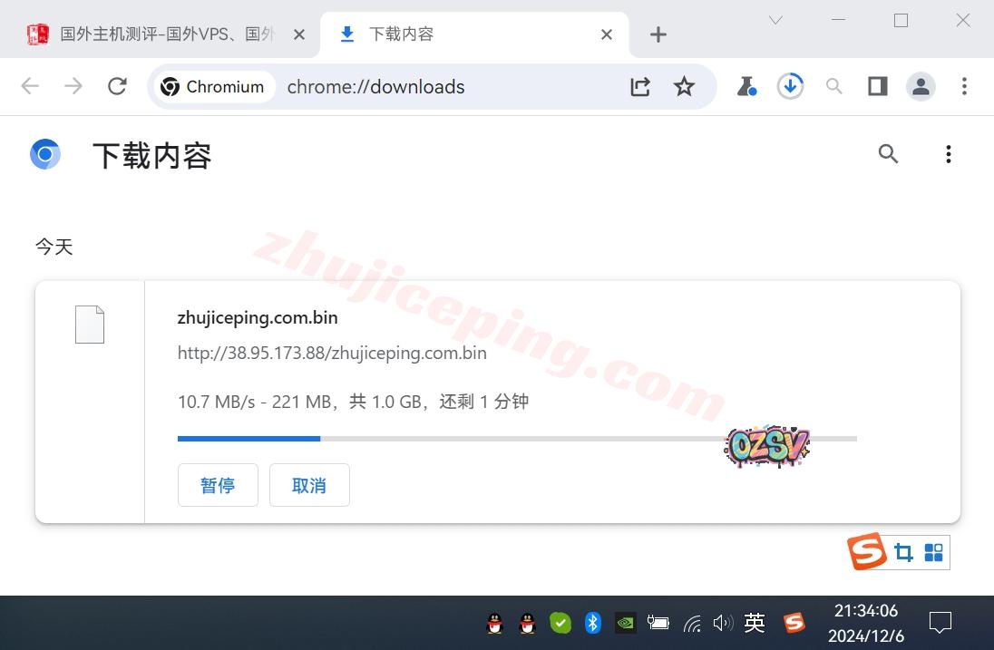 存放在测试VPS上的文件,站长用广州联通家宽、用Chrome浏览器下载该文件,大致的下载速度如下:
