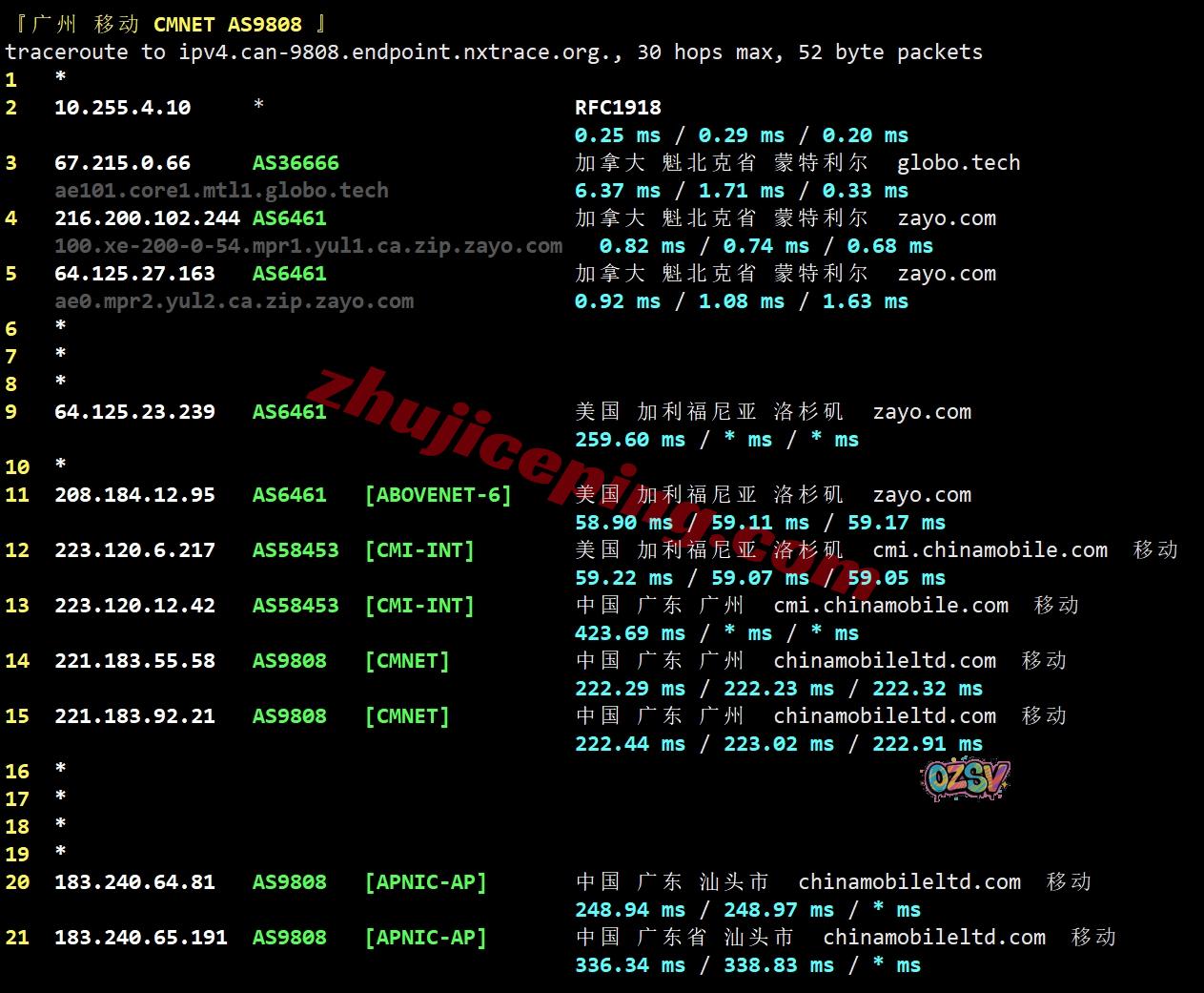 移动去程:直连移动美国洛杉矶节点然后接zayo经过丹佛、堪萨斯等去加拿大多伦