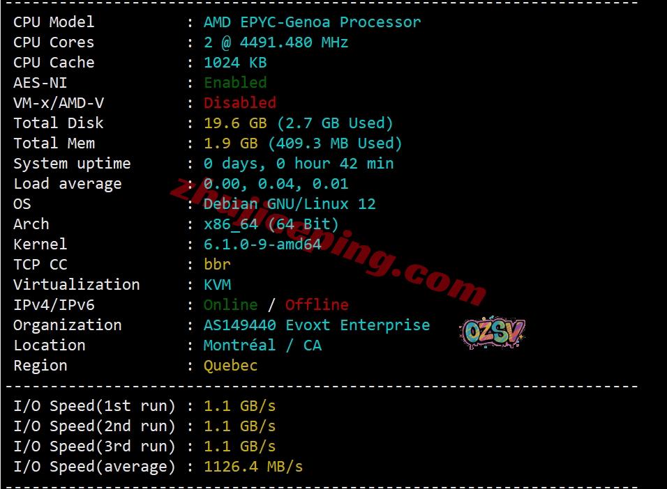 evoxt怎么样?evoxt加拿大vps怎么样?evoxt最近新上了加拿大vps业务,具体数据中心位于加拿大的蒙特利尔市。据网友们传:用的是高端AMD EPYC 9004高性能平台。根据evoxt的一贯风格最低配也就卖2.99美元/月,给这么高端的硬件,真的靠谱吗?加拿大来国内的网络怎么样?性能是真的有那么强悍吗?会不会超卖比较严重?要回答一些问题,主机测评特意下单弄了个,接下来给大家带来的是详细的测评数据,仅供参考。