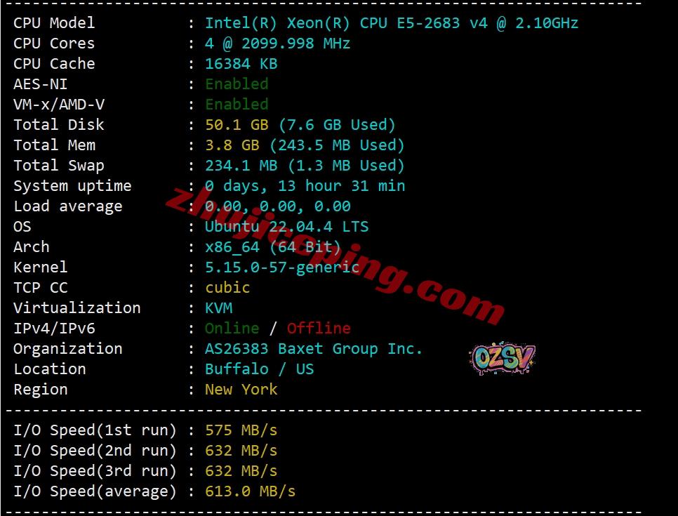 服务器用的CPU型号是e5-2683v4(一般是双路,32核、64线程、主频2.1GHz、加速3.0GHz),不支持IPv6,归属美国纽约州水牛城,当前I/O大致在613MB/S: