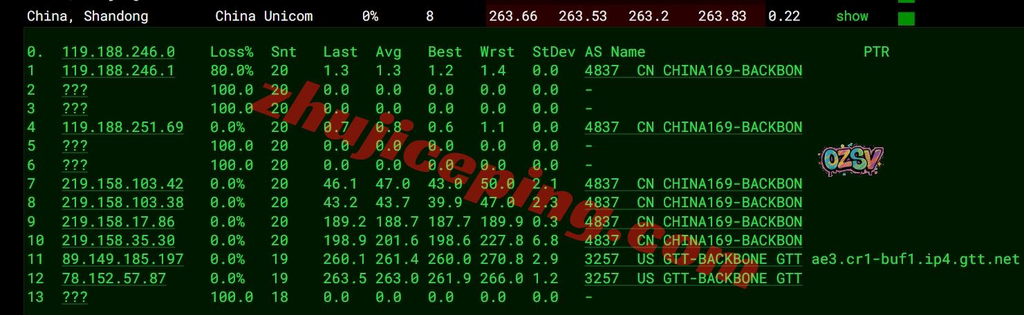 联通去程:直连联通美国洛杉矶节点然后转GTT去美国纽约