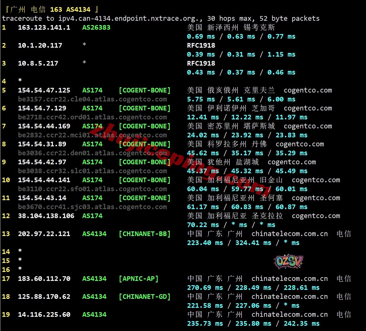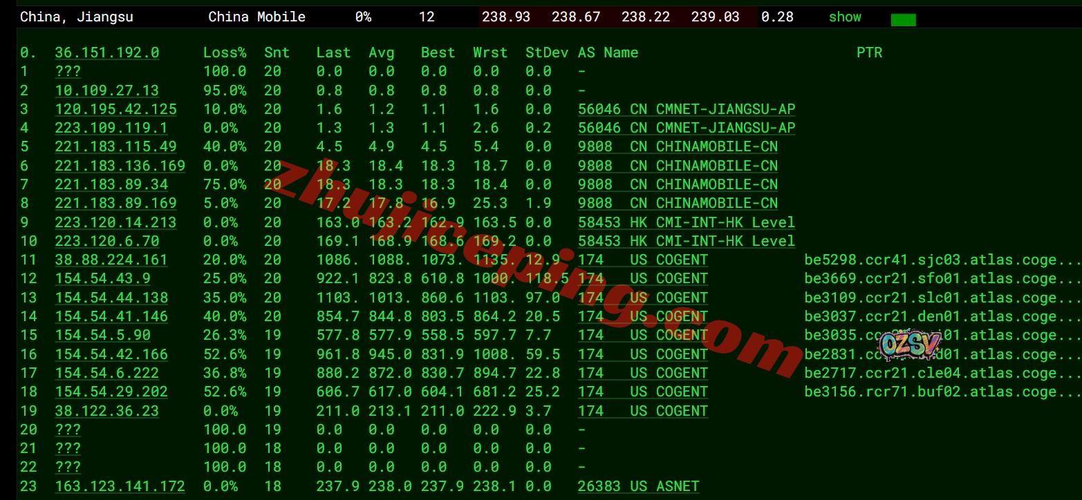 移动去程:直连移动美国圣何塞节点然后转cogent一路去东海岸纽约
