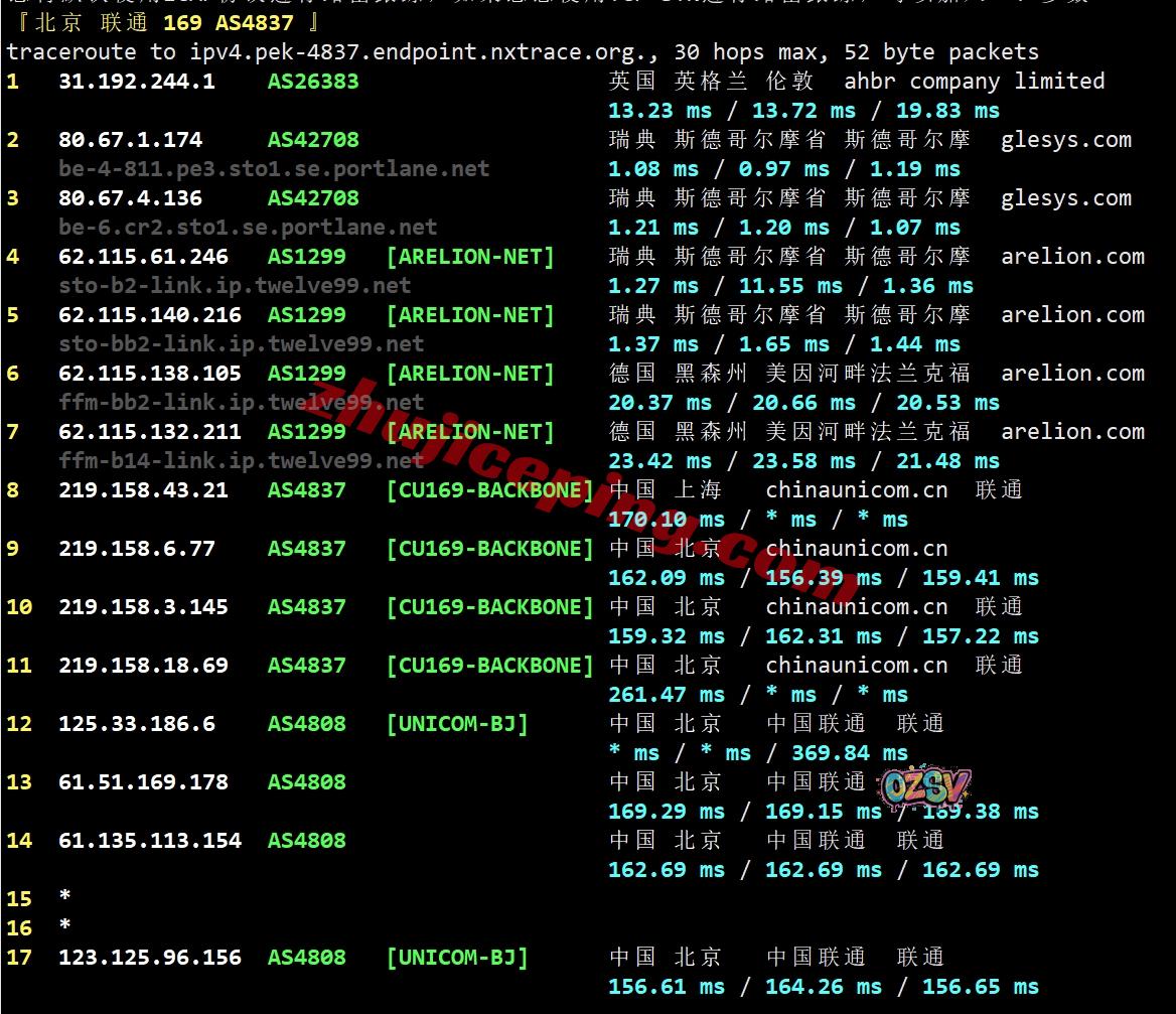 联通回程:机房portlane出来对接telia经过德国出海回国