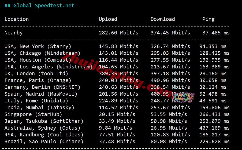 speedtest.net的部分国际节点的测试数据: