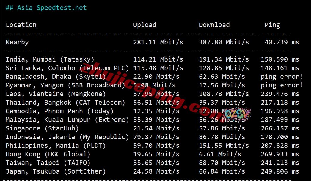 speedtest.net的部分亚洲节点的测试数据: