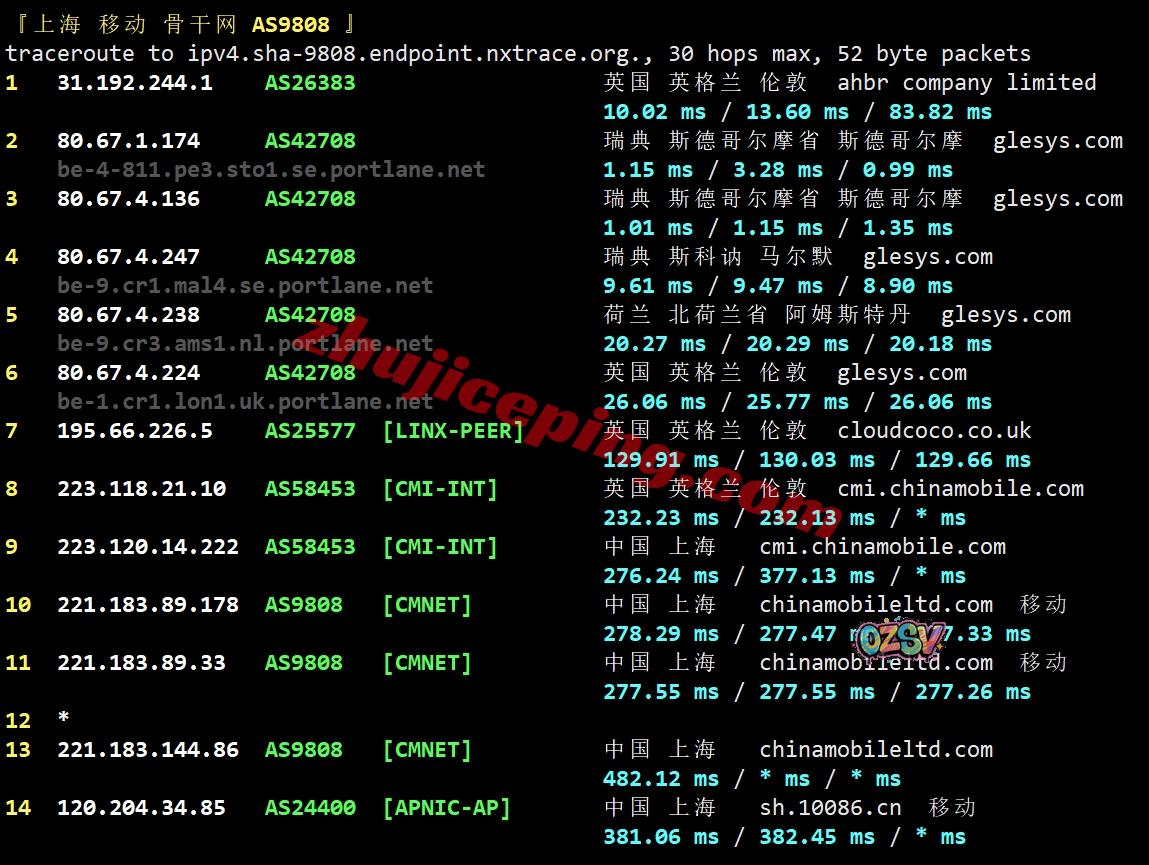 移动回程:直连移动英国节点,然后走portlane经过荷兰去英国,在伦敦转移动CMI回国