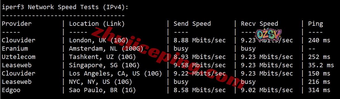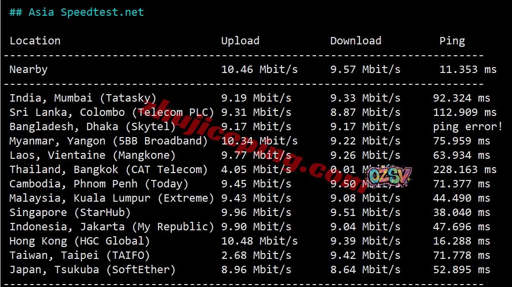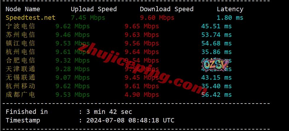 测试用的VPS默认10M带宽,境内三网多节点的带宽上下行测试,大致数据如下:
