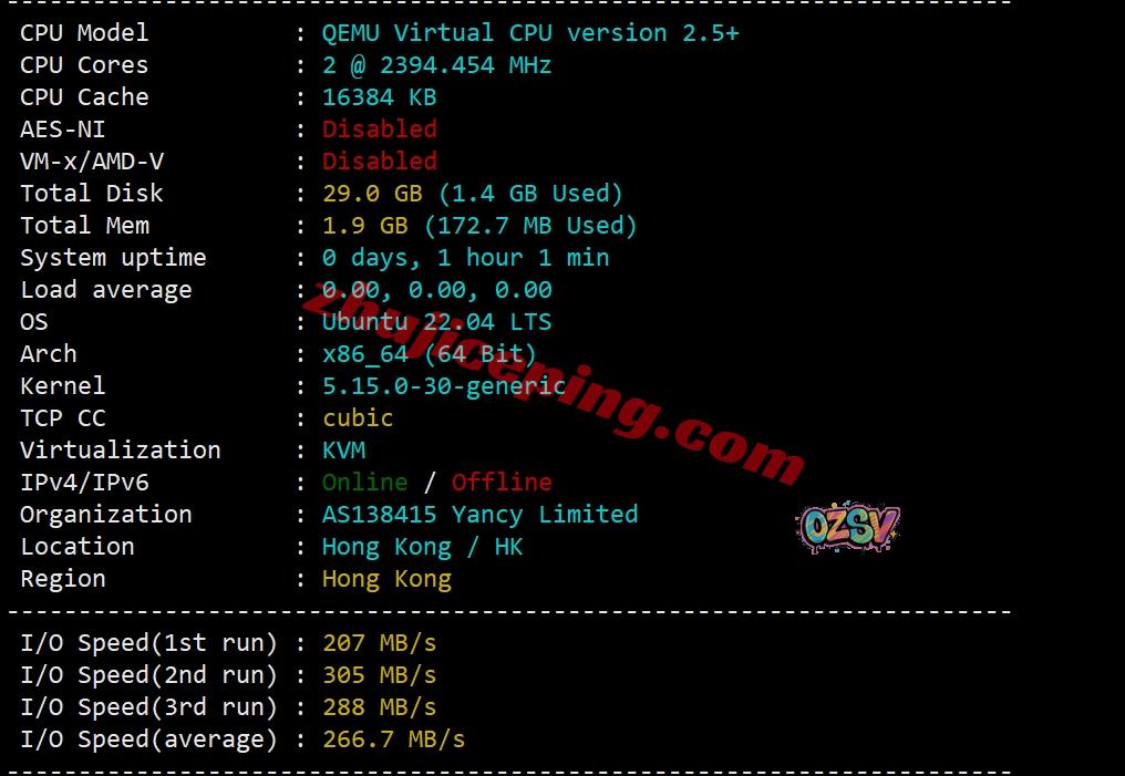 服务器用的CPU具体型号未知,主频2.4GHz,不支持IPv6,归属地香港,当前硬盘I/O大致266MB/S: