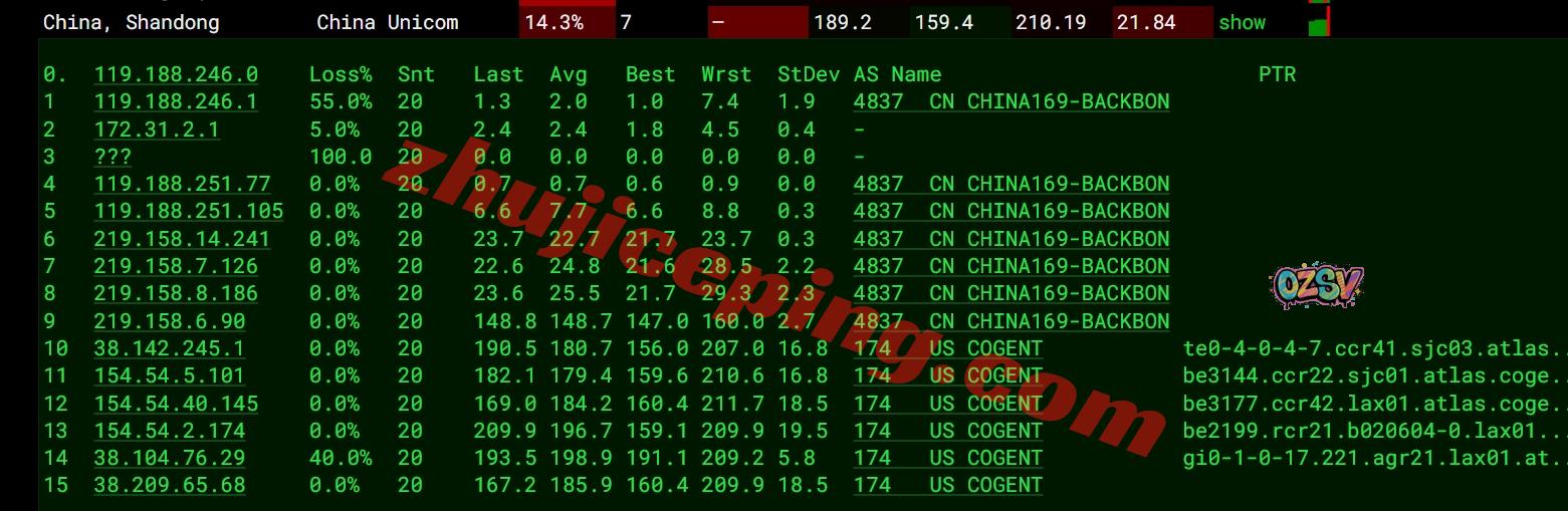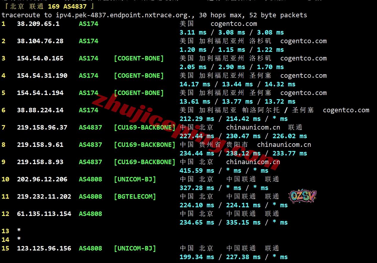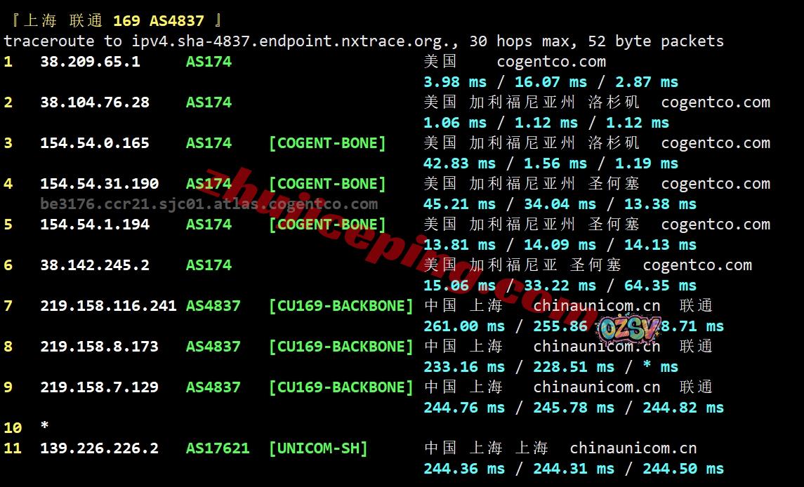 联通去程:直连联通洛杉矶节点然后走cogent去圣何塞再回洛杉矶