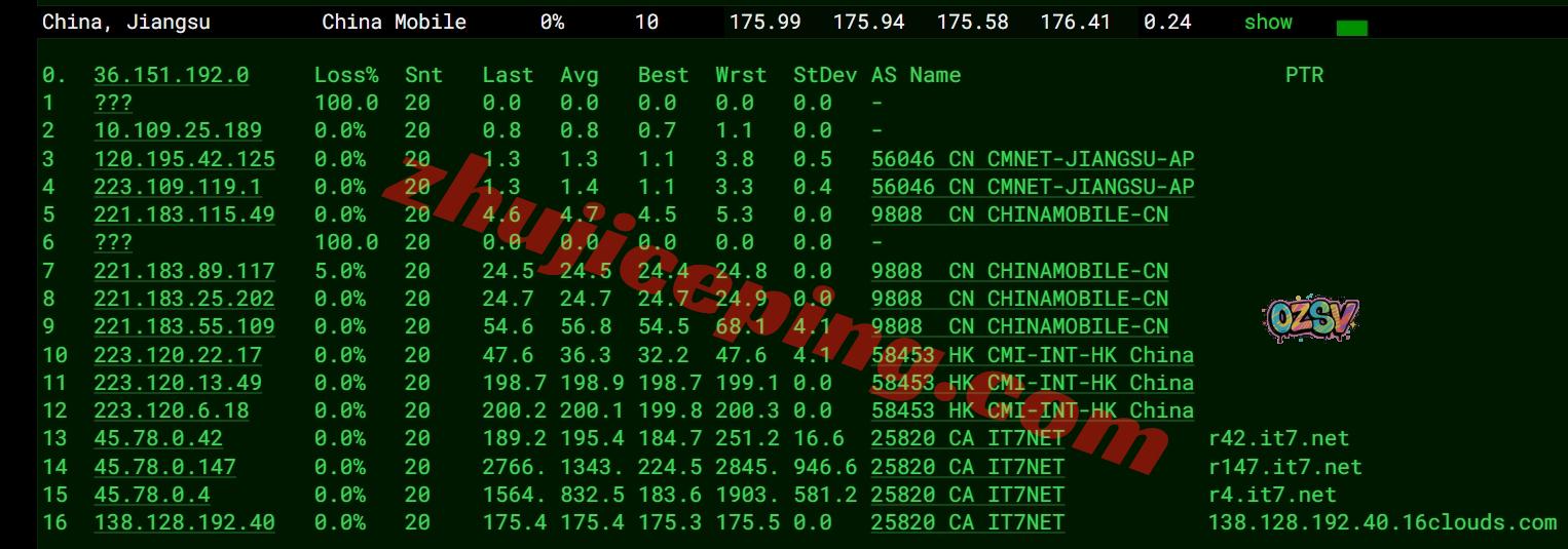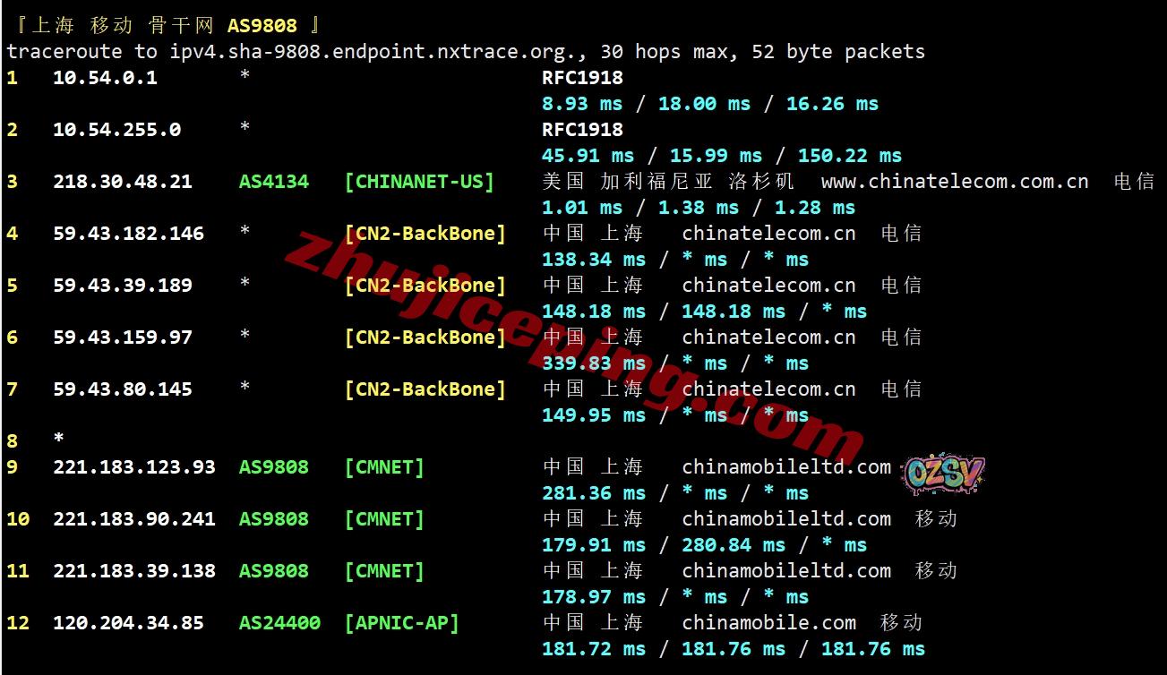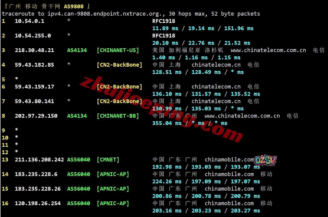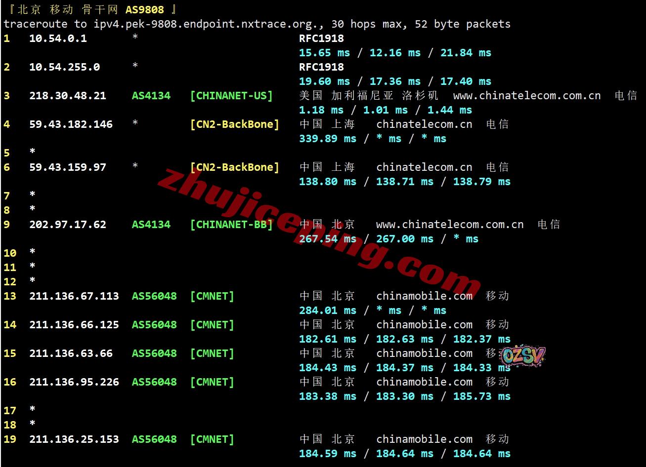 移动回程:走电信CN2高端链路由洛杉矶出海直连回国