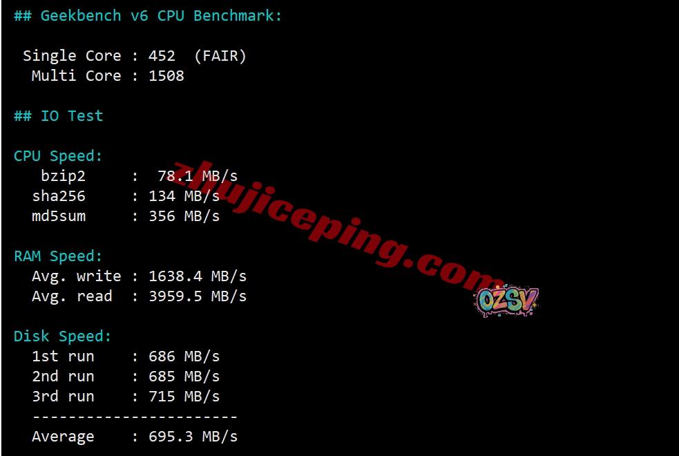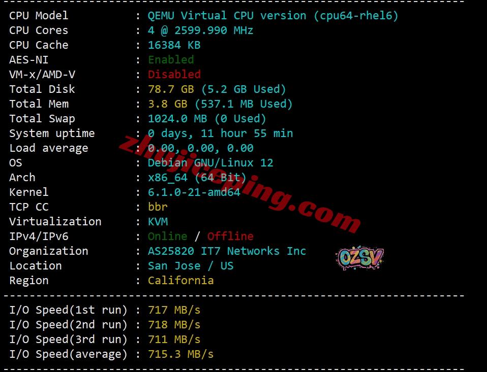 CPU型号未知,大致主频2.6GHz,系统模板自带BBR,不支持IPv6,归属地圣何塞,当前大致I/O为715MB/S: