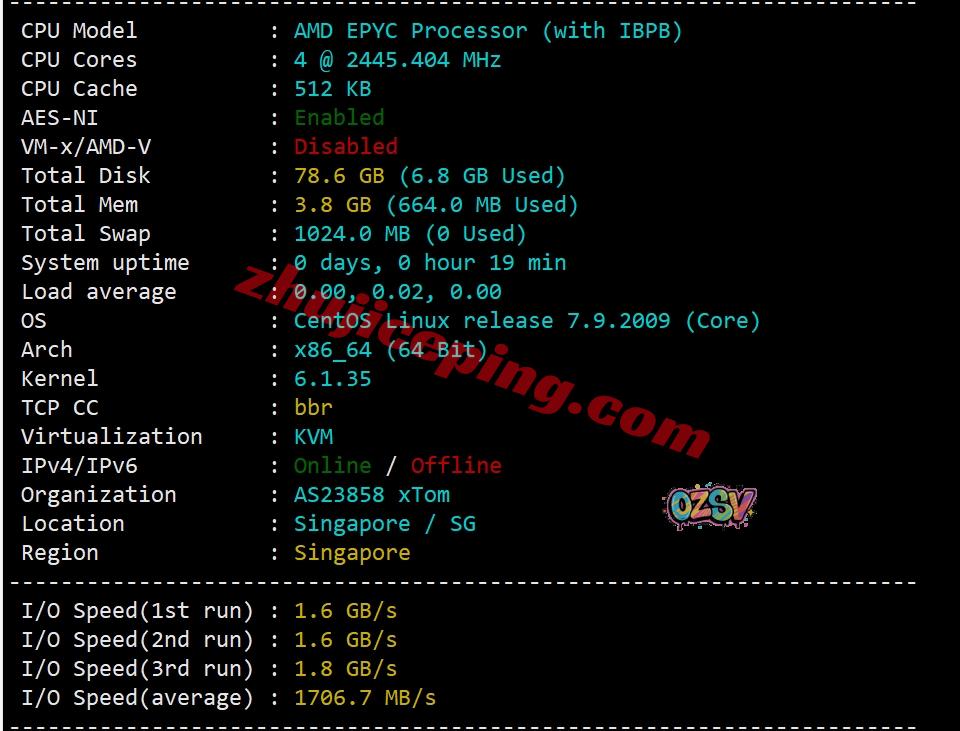 服务器用的CPU为AMD EPYC,主频是2.45GHz,根据上游提供商的信息来判断具体型号应该是“AMD EPYC 7763”,第三代AMD EPYC 7003… 搬瓦工的系统模板默认启用了BBR,上游网络提供商为XTOM,归属地为新加坡,当前硬盘I/O大致1706MB/S: