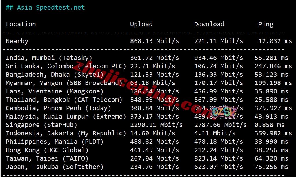 speedtest.net 的部分亚洲区域内的节点的测试数据: