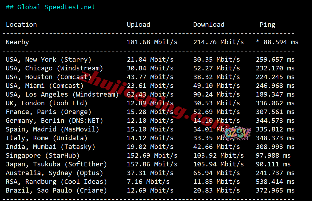 speedtest.net的部分国际节点的测试数据: