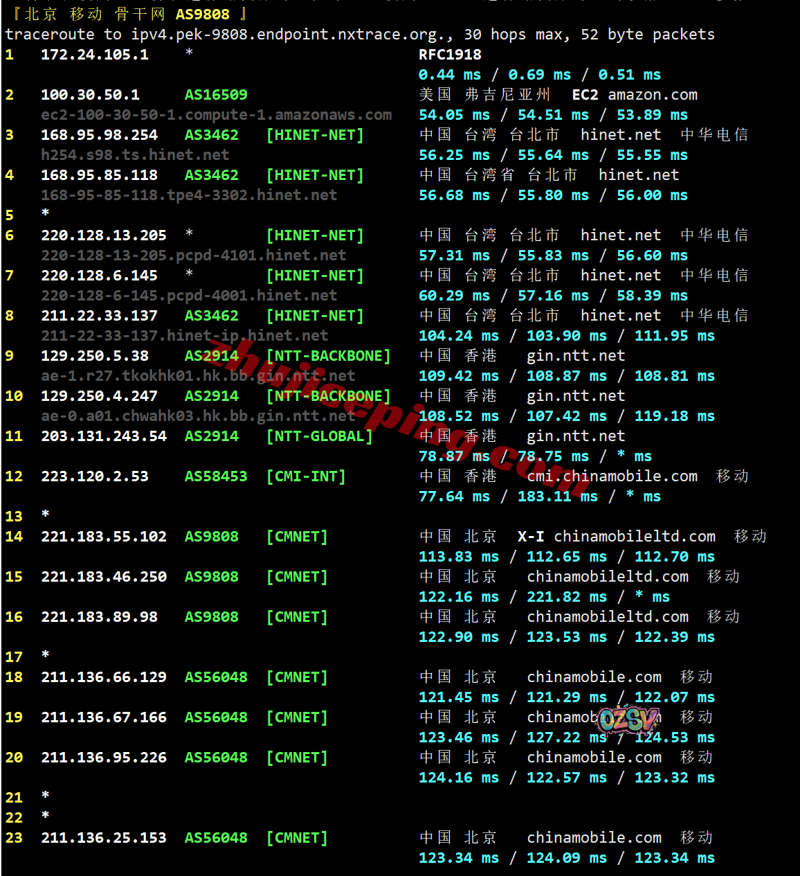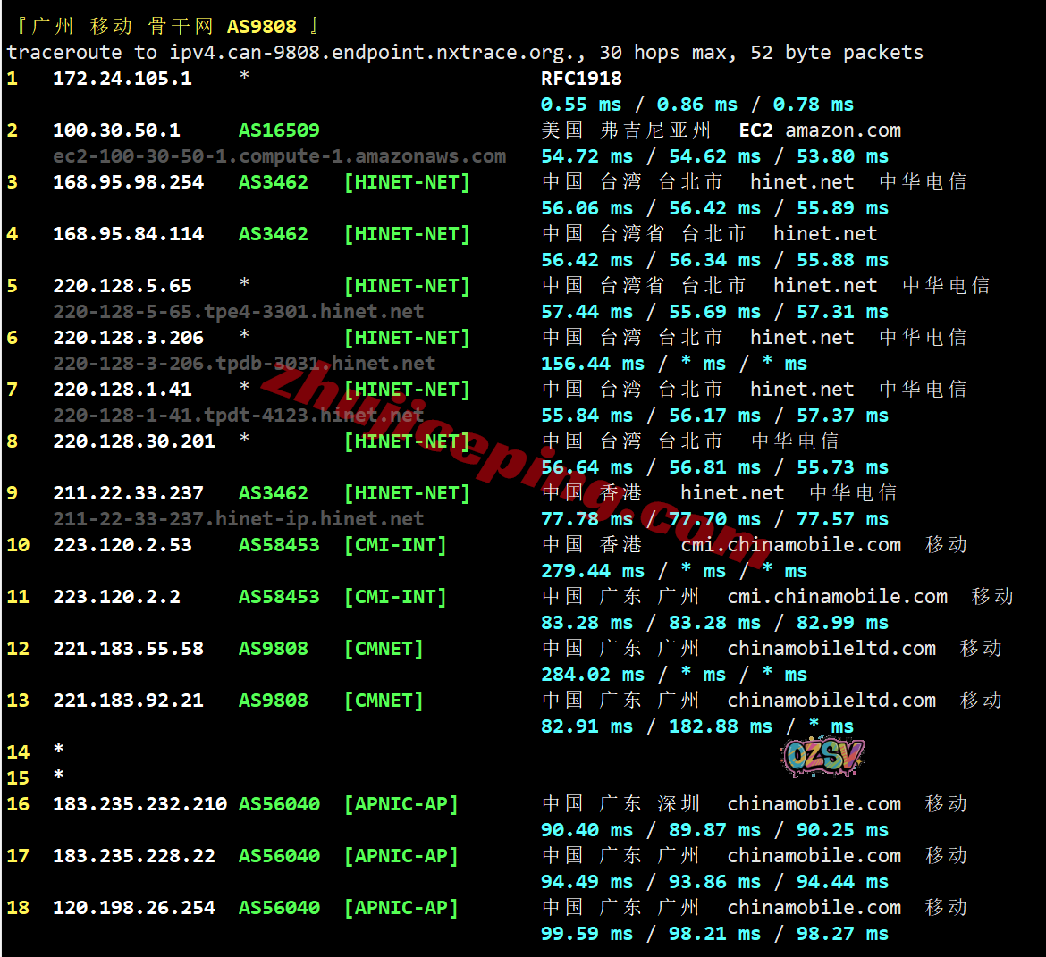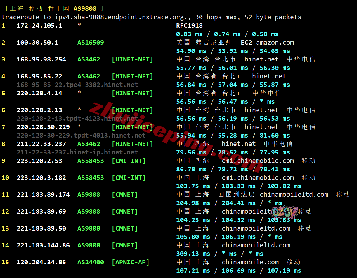 移动回程:hinet连香港NTT然后转移动CMI直连内地