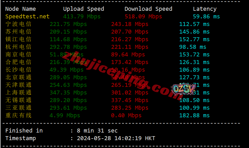 国内三网多节点的带宽上下行测试数据: