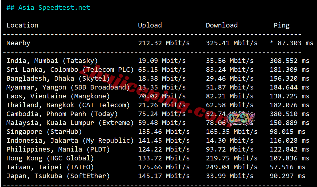 speedtest.net的部分亚洲节点的测试数据: