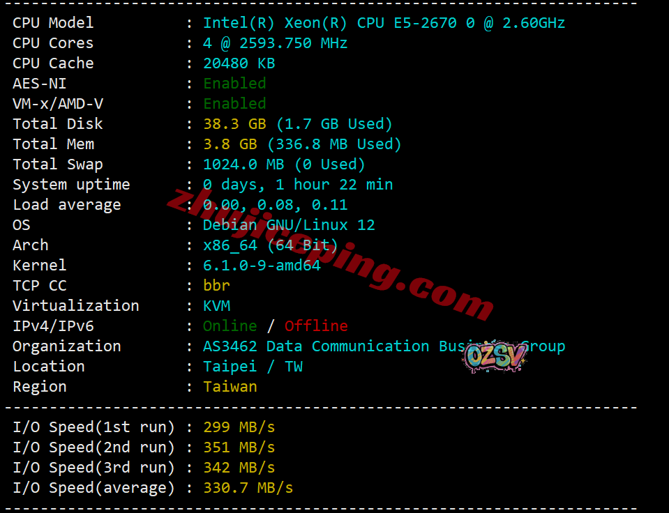 服务器用的CPU型号为e5-2670(一般双路,16核、32线程、2.6GHz主频、3.3GHz加速频率),站长开启了BBR,不支持IPv6,归属地台湾,当前I/O大致330MB/S的样子: