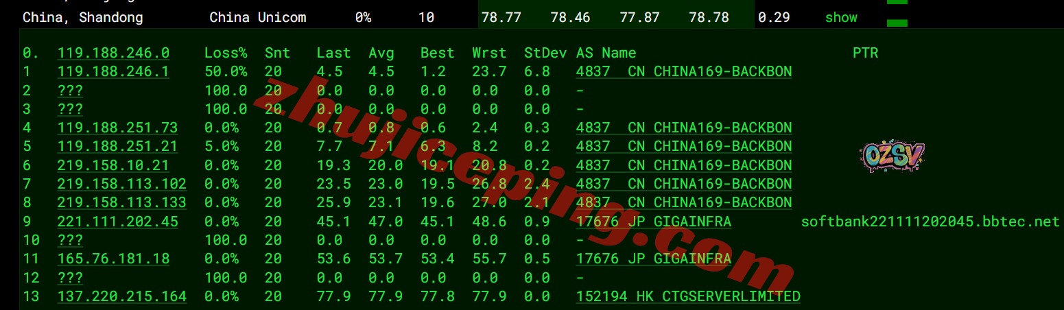 联通去程:骨干网接日本软银去机房