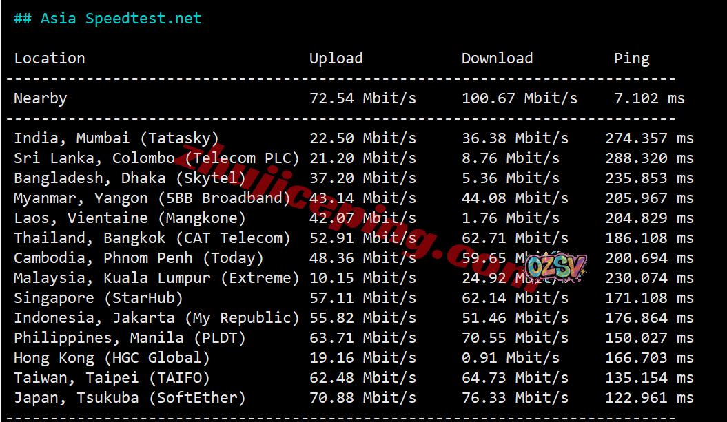 speedtest的部分亚洲节点测试: