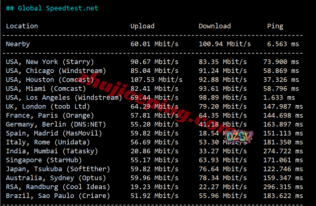 speedtest的部分国际节点测试: