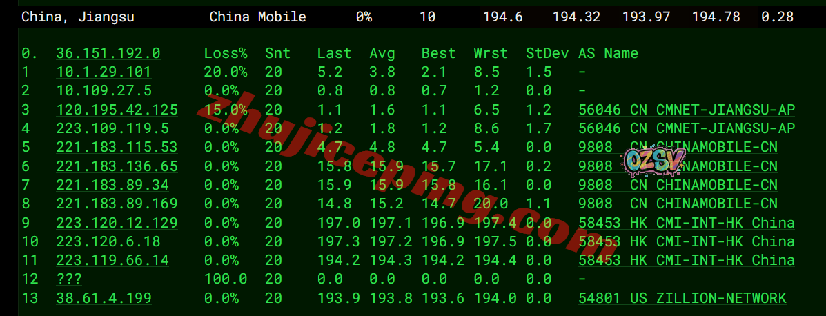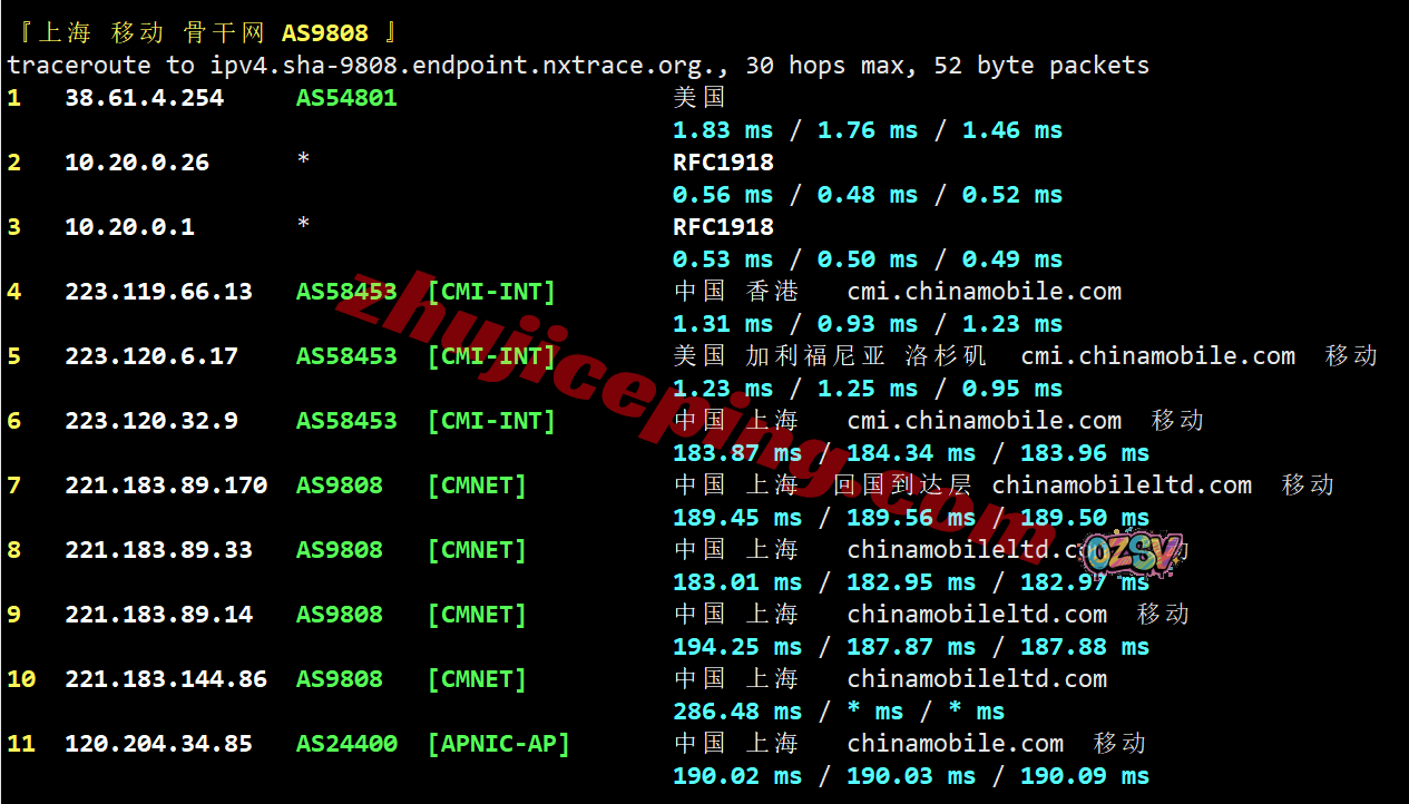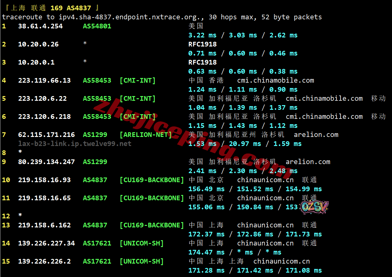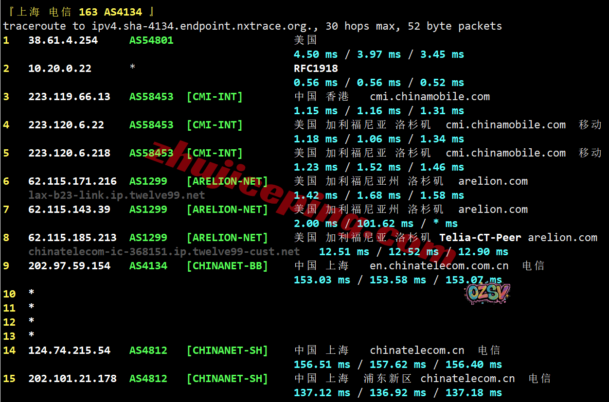 上海方向:从移动洛杉矶节点出来接twelve99出海回国