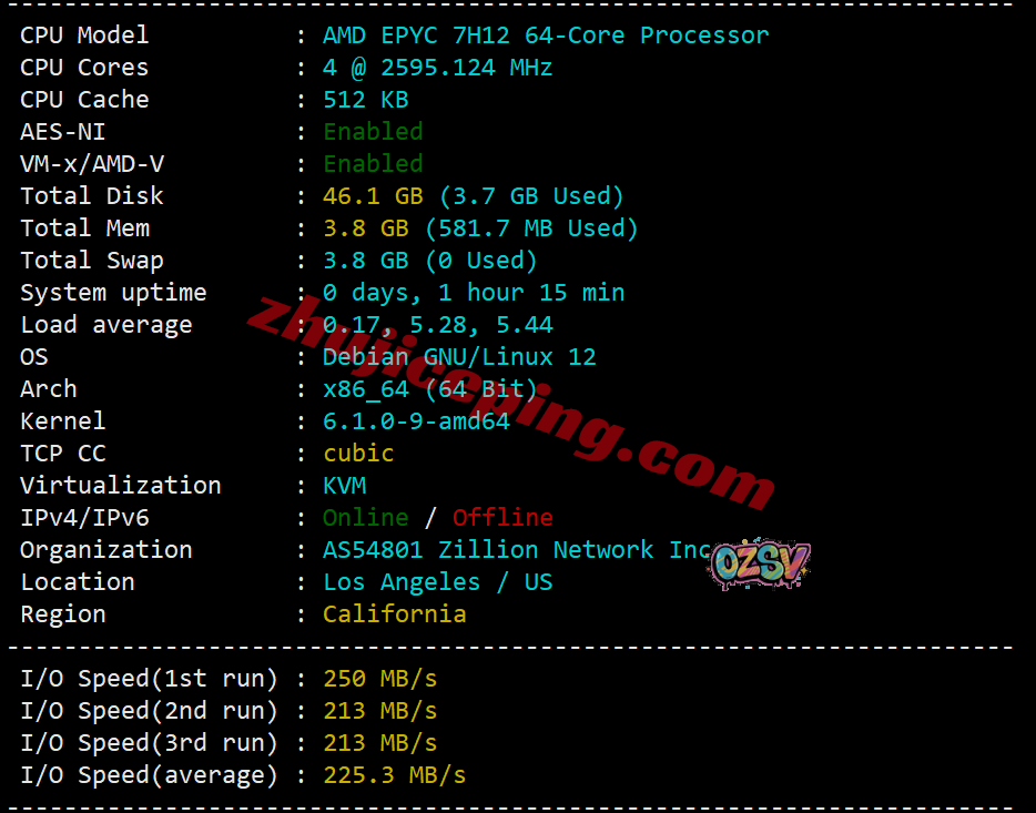 服务器用的CPU型号为AMD EPYC 7H12(64核、128线程、2.6GHz主频、3.3GHz加速频率),不支持IPv6,归属地洛杉矶,当前I/O大致225MB/S: