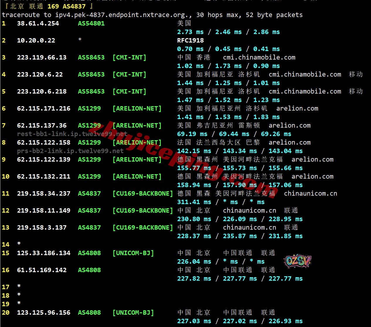 北京方向:从移动洛杉矶节点转twelve99从美国东海岸出海去法国、德国,然后从联通法兰克福节点直连回国