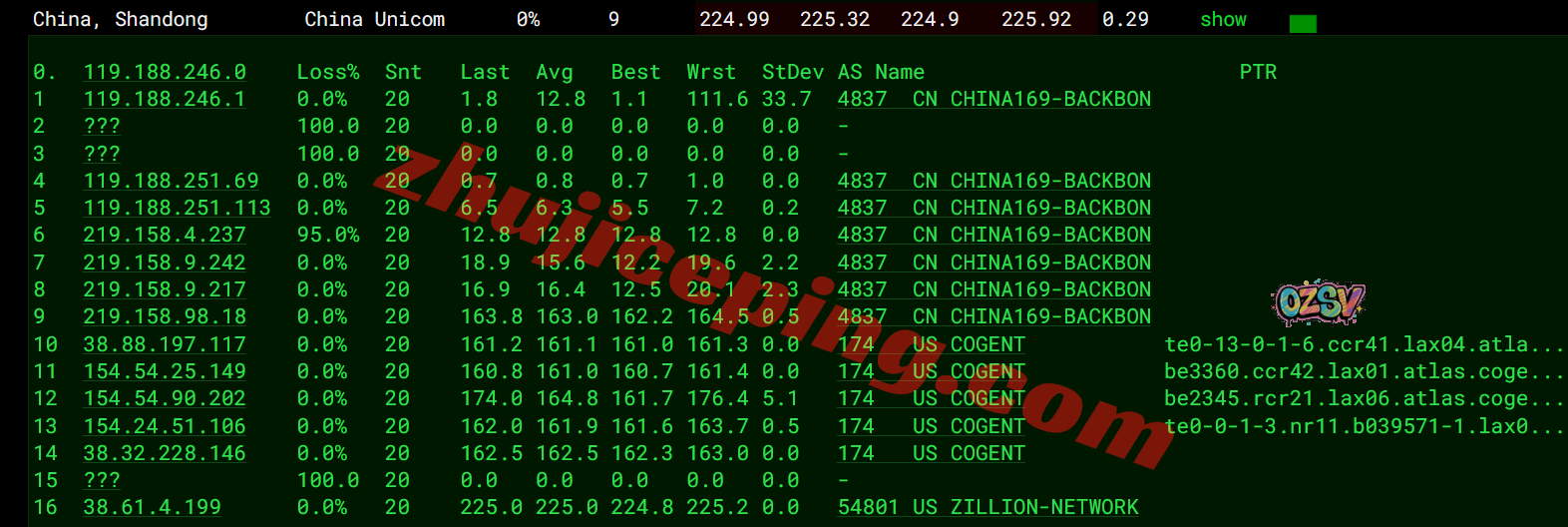 联通去程:直连联通美国洛杉矶节点,然后接cogent去机房
