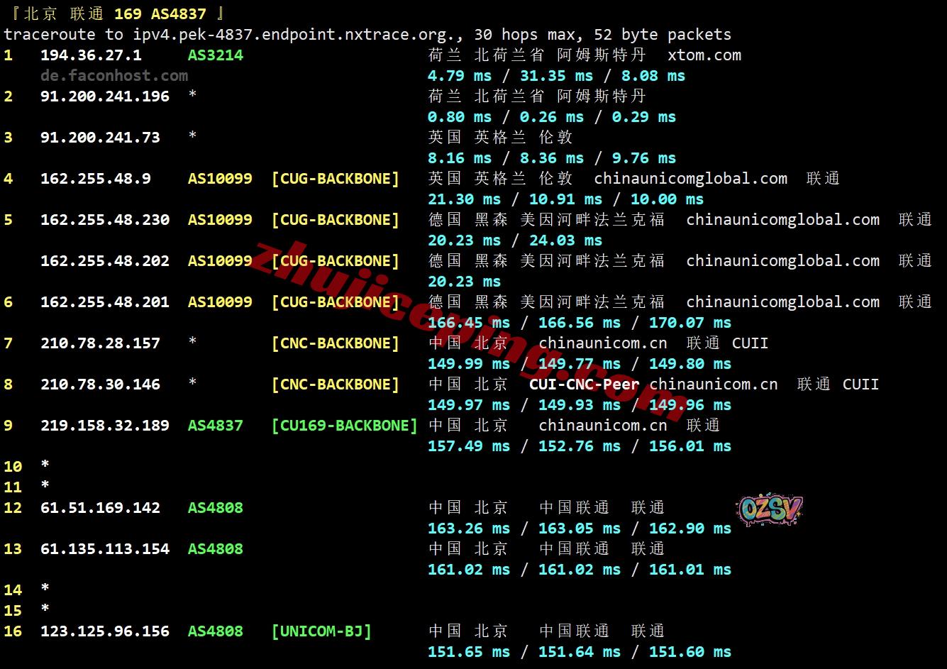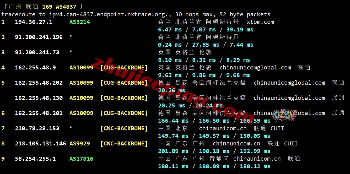 联通去程:AS4837接AS9929再接AS10099直连联通德国法兰克福,然后去荷兰